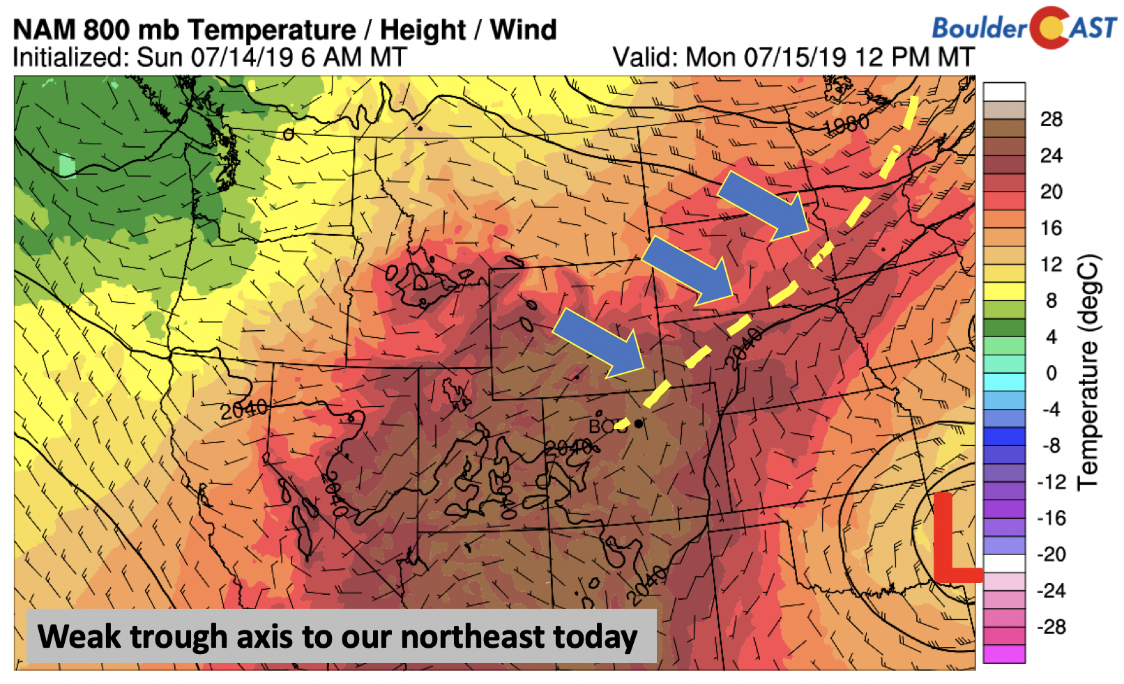 Although likely not a huge player in today’s forecast for the Metro area, there is a weak trough axis to our northeast from Minnesota southwest into Nebraska and northeast Colorado. The same mid-level pattern we experienced this past weekend is still in-place, and this trough axis will concentrate lift once again over the area for scattered late-day storms, particularly across far northeast Colorado where some storms could even turn severe Monday afternoon and evening.