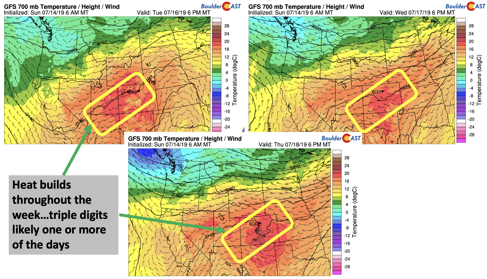 This week will feature very hot temperatures across the Front Range with some areas likely pushing into the triple digits. Storm chances will exist only early in the week. We cover the HEAT WAVE at-hand and the potential for monsoon moisture making it to Colorado just in time to cool us off for the upcoming weekend.
