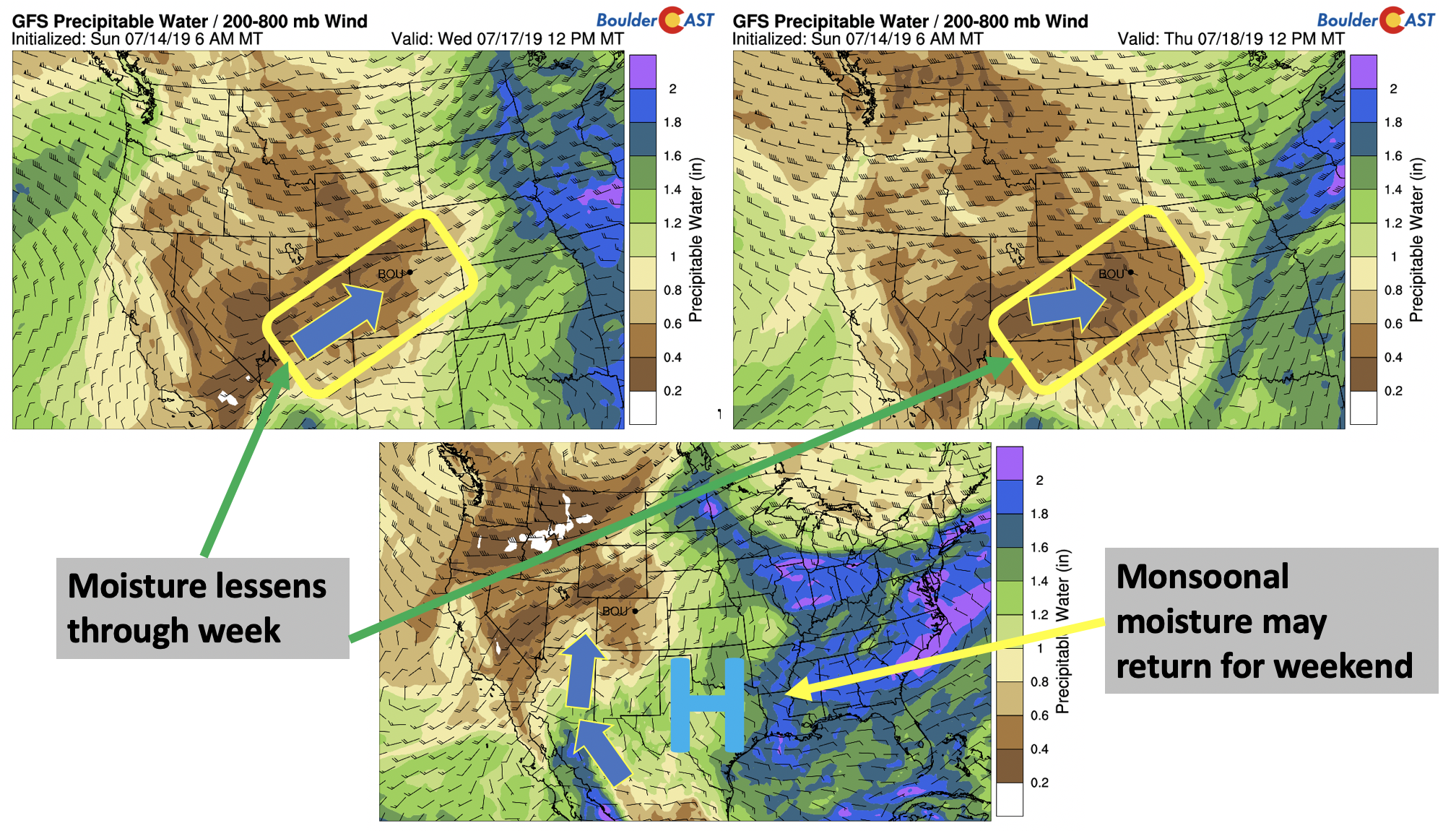By Friday, though (above center), there are signs that monsoonal moisture may re-emerge across the state for the upcoming weekend. The ridge is partly predicted to drift a little to our southeast, allowing a southerly flow, as opposed to southwesterly, bringing deeper moisture content into Arizona and Colorado. Models have not done a great job predicting the exact location of this high recently, so it is definitely uncertain at this point. Friday will likely still remain very hot and dry, but the weekend may see storms return to the forecast for the Mountains and Plains with temperatures trending a little cooler.
