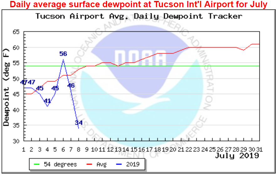 This flow of moisture may be the early signs of the monsoon taking shape. A check on the latest dew points from Tucson, AZ shows that monsoon moisture has yet to arrive: