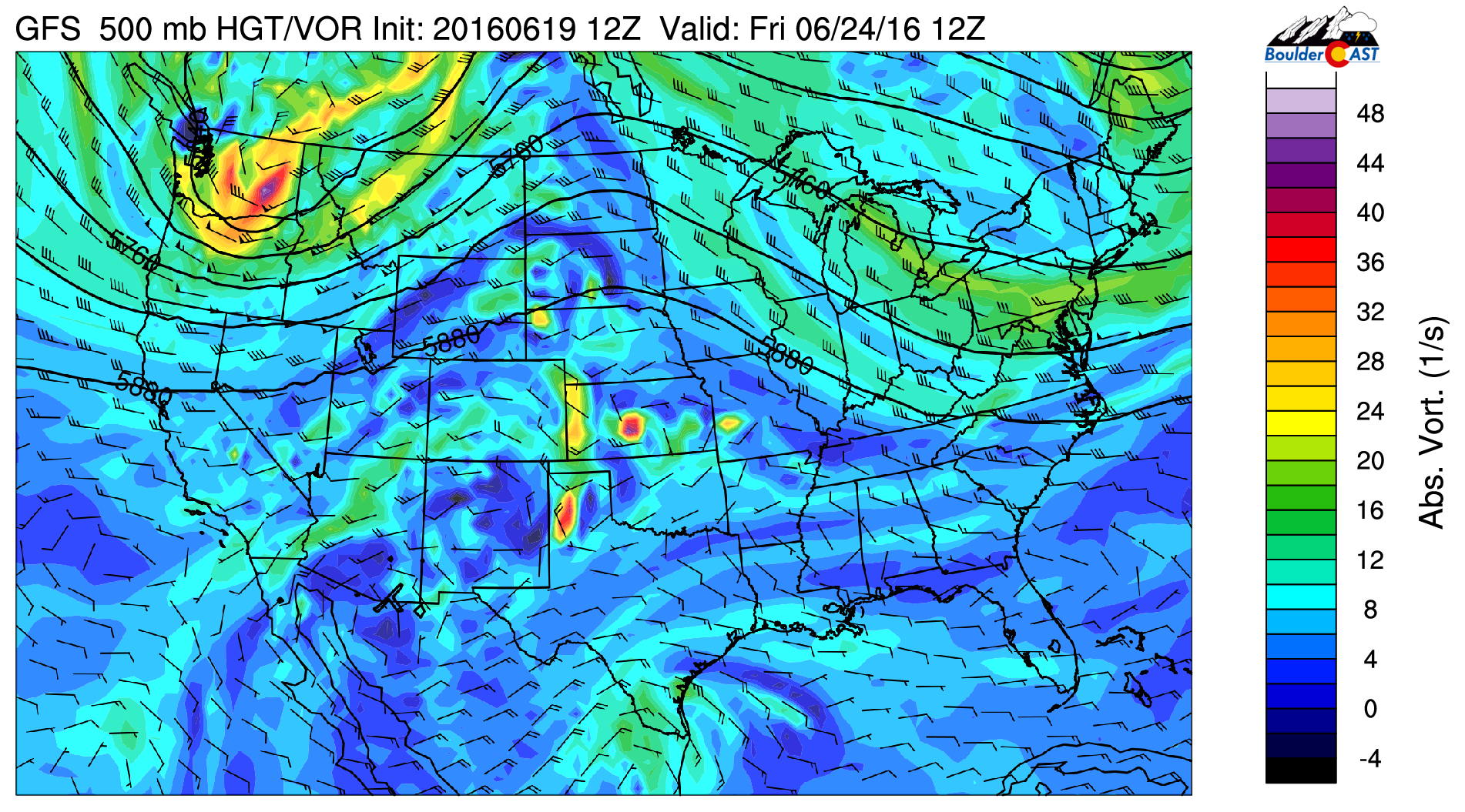 GFS 500 mb vorticity map for Wednesday. The ridge has flattened, but largely remains intact. The northern fringe of the country is in the midst of a very active storm track!