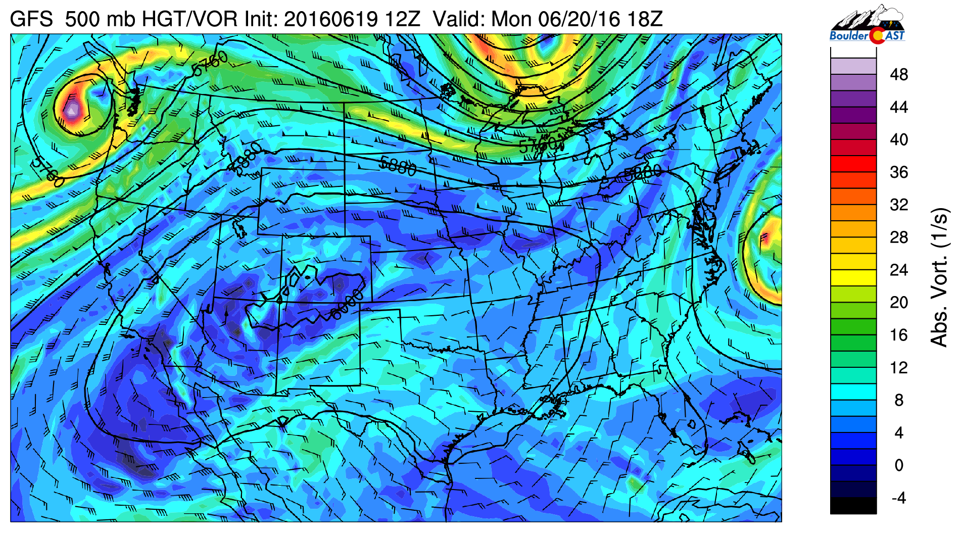 Let’s start off with a current view of the atmosphere across the United States at the 500 mb level. The ridge that has dominated our weather for more than a week is still loitering on the streets of Colorado. Notice the core of the ridge below, the 6000-meter high across the Four Corners region.