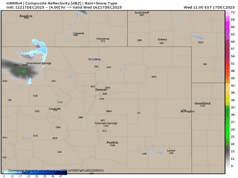 Meanwhile, the mountains will see several inches of snow as the trough and moisture pulse move through this afternoon and evening. Jet‑driven snow bands could dump over an inch per hour along and west of the Divide, creating blizzard‑like conditions with 90 MPH wind gusts thrown into the mix. Travel into the High Country tonight is strongly discouraged, especially around Rocky Mountain National Park and into the Park Range near Steamboat.