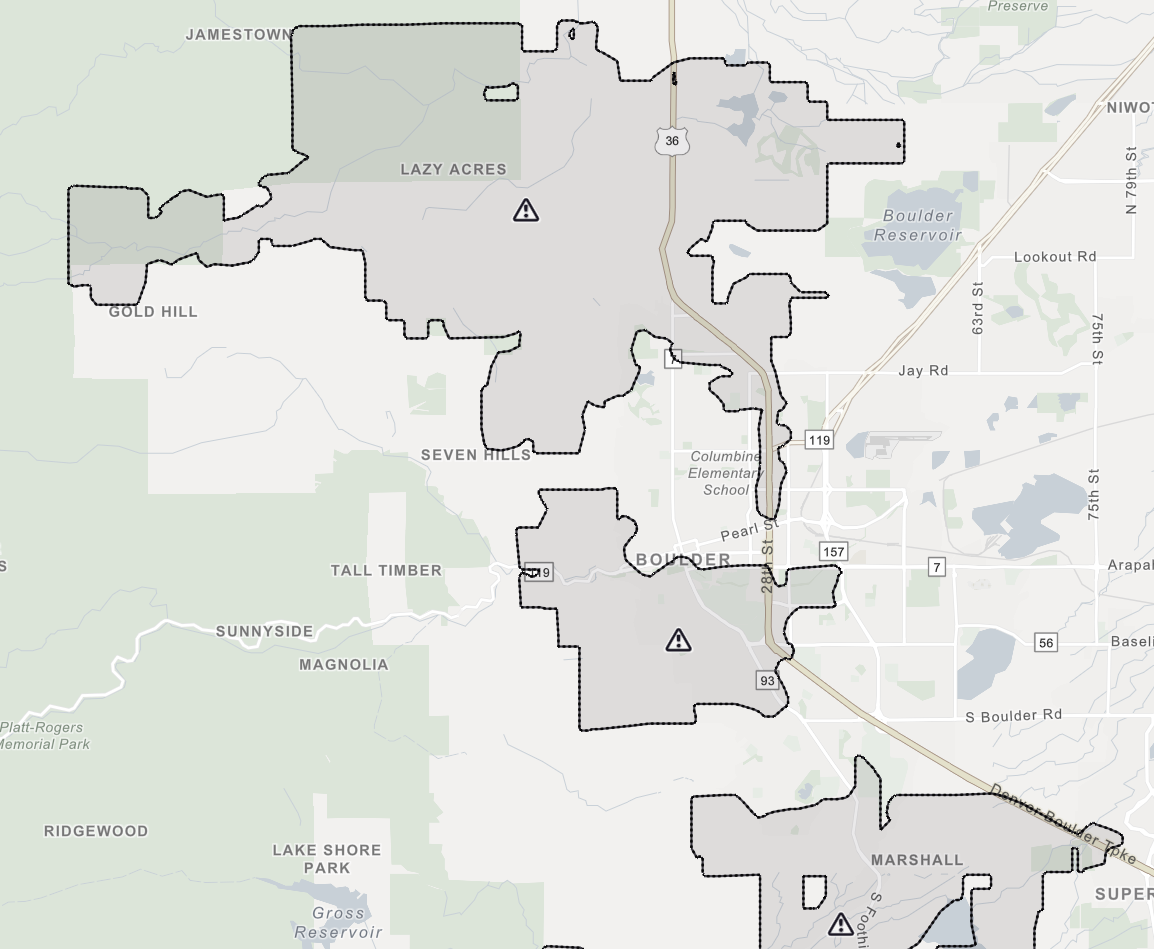 Potential Xcel shutdown map for the Boulder area (updated Tuesday evening). This may not be the final map.