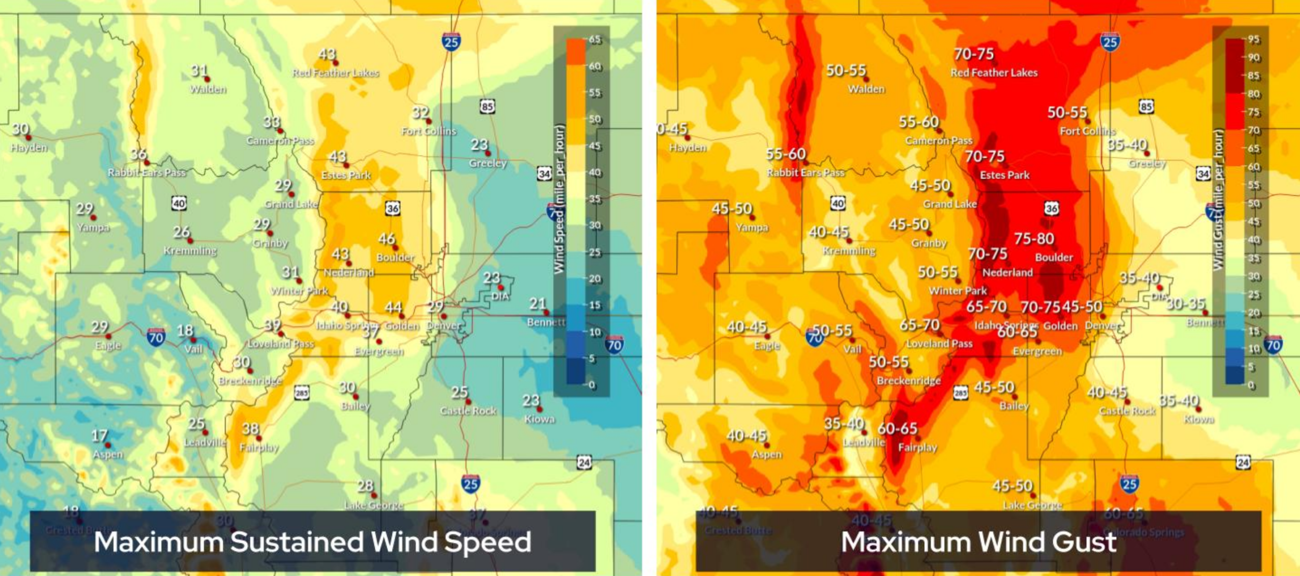 - Foothills and wind‑prone spots (Boulder, Rocky Flats, Broomfield Airport, west Arvada): Peak gusts of 70–90 MPH are likely.