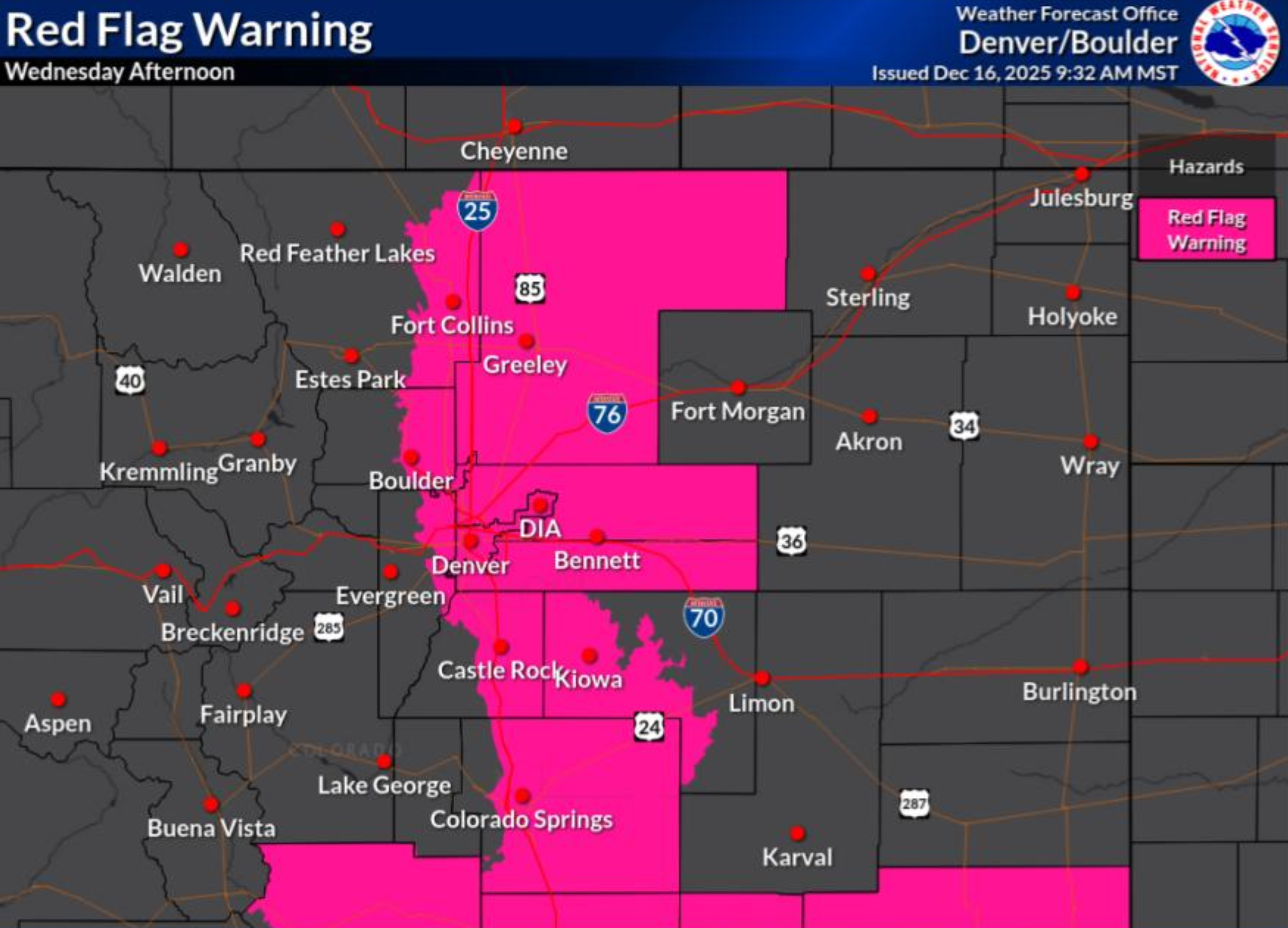 Red Flag Warnings are in effect from 11 AM to 6 PM below 6000 feet elevation. This covers a huge area: Fort Collins, Longmont, Boulder, Denver and suburbs, DIA, Castle Rock, Colorado Springs, and Pueblo. With millions of people across more than a dozen counties, the hope is for no new ignitions—but that’s a tall order.