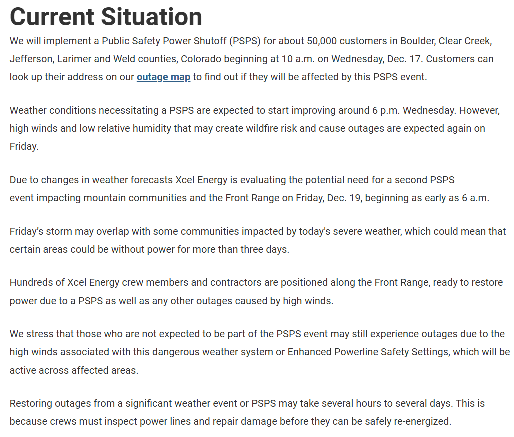 Xcel is also already advertising another potential shutoff event on Friday, with potentially some customers remaining completely without power for 3+ days. The latest information from the Xcel website for today’s event and how Friday’s shutoff may go is included below.