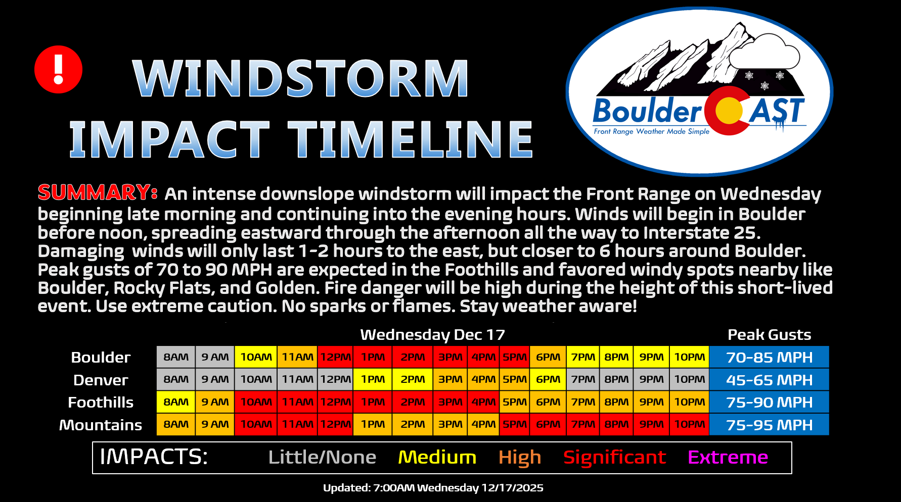 - 🌬️ Extreme Winds: Downslope winds ramp up late morning, peaking during the afternoon at 70–90 MPH in Boulder/foothills, 45–70 MPH near I‑25. Winds begin to relax by early evening.