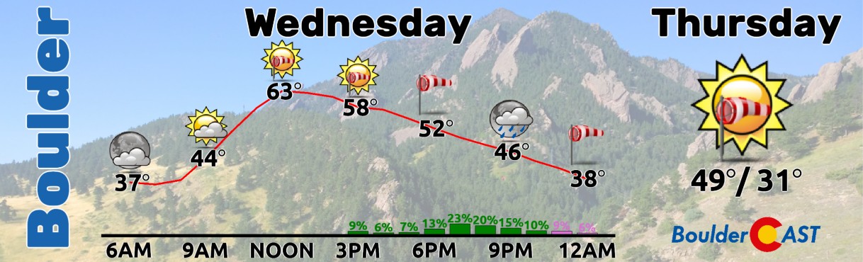 Outside of the extreme windstorm, high fire danger, chance of showers this evening and the Mountain snow squalls, today will be pretty nice for the area with highs reaching the middle 60s in Boulder and Denver. Thanks to the cold front, Thursday will be colder, topping out in the upper 40s. Unfortunately it looks like we are going to see another strong windstorm on Friday, but there’s lots of uncertainty regarding intensity and how far east those winds may reach.
