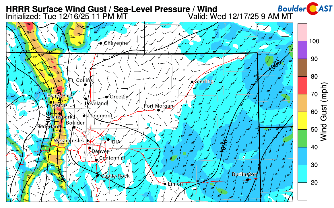 - Farther east (DIA, Aurora, Parker): Winds drop off quickly, mostly 30–40 MPH or less.