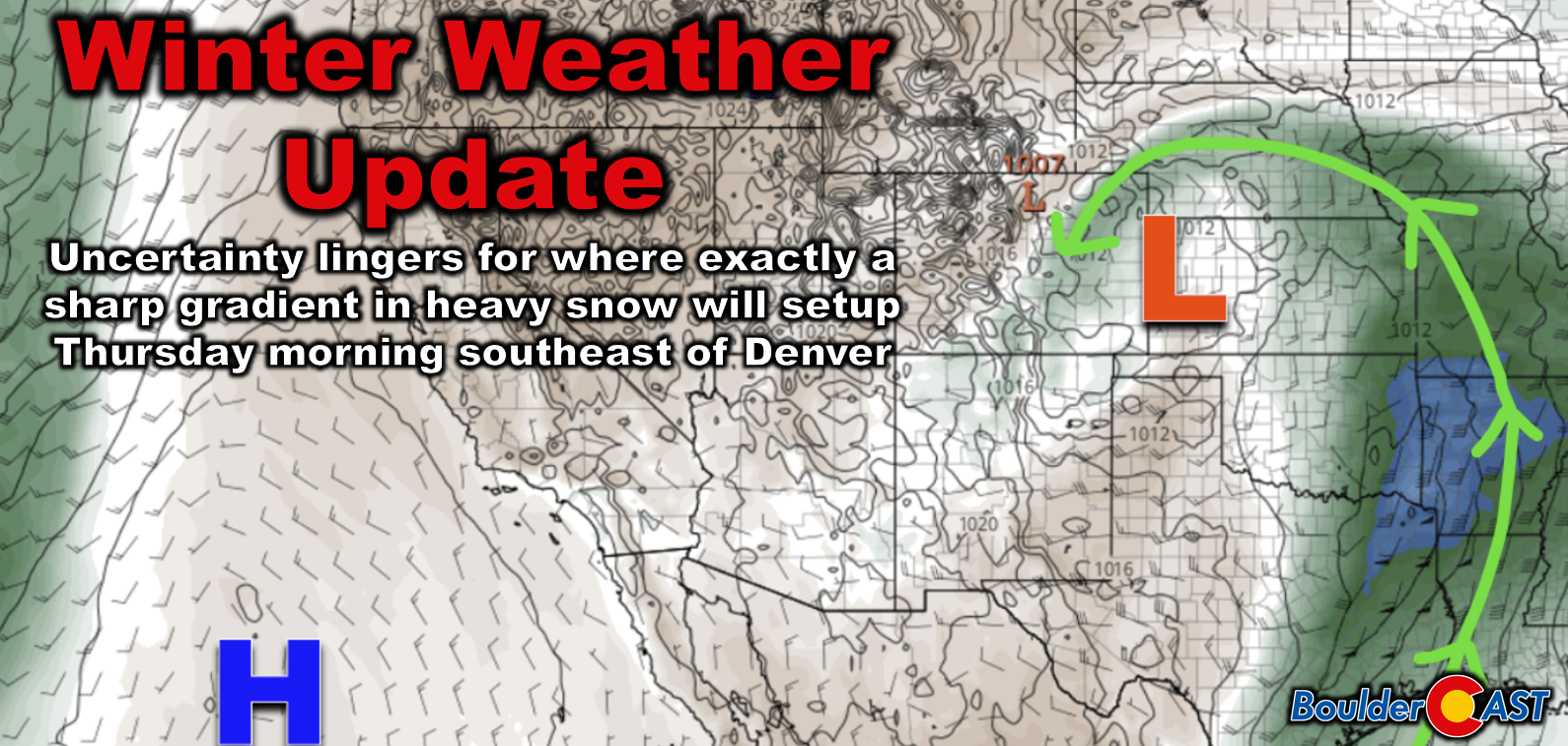 A medium-impact winter storm is headed for eastern Colorado, bringing some snowfall and strong winds to parts of the Denver Metro area late Wednesday night into Thursday afternoon. Weather models show varying predictions, but the southern and southeast suburbs of Denver are favored most for up to a couple inches of snow, with higher totals possible along and east of the Palmer Divide. We discuss the rift in the model guidance that is leading to the uncertainty, as well as the latest timing and most likely outcome from this somewhat warmer southern-track winter storm.