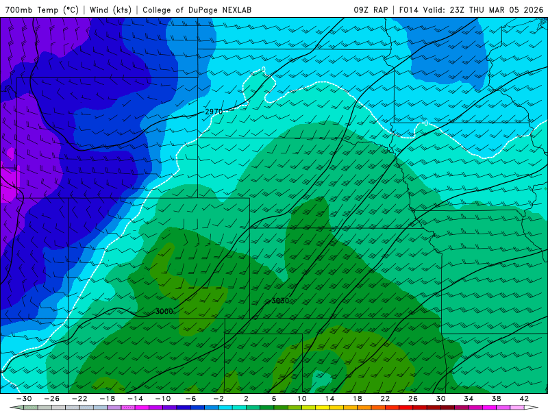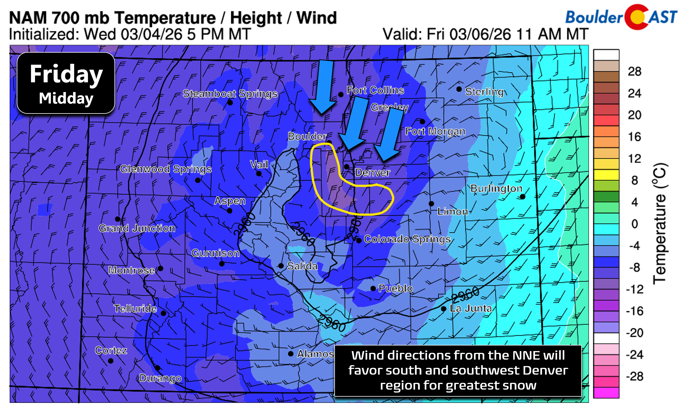 After a winter dominated by marginal temperatures and more rain than snow, this storm will finally bring a sufficiently cold column of air. 700 mb temperatures are forecast to fall below –7°C Friday, cold enough to lock in snow as the dominant precipitation type for our entire area. That north-northeasterly upslope flow will favor the southern and southwestern portions of the Denver Metro area (i.e. Palmer Divide and the Jefferson County Foothills).