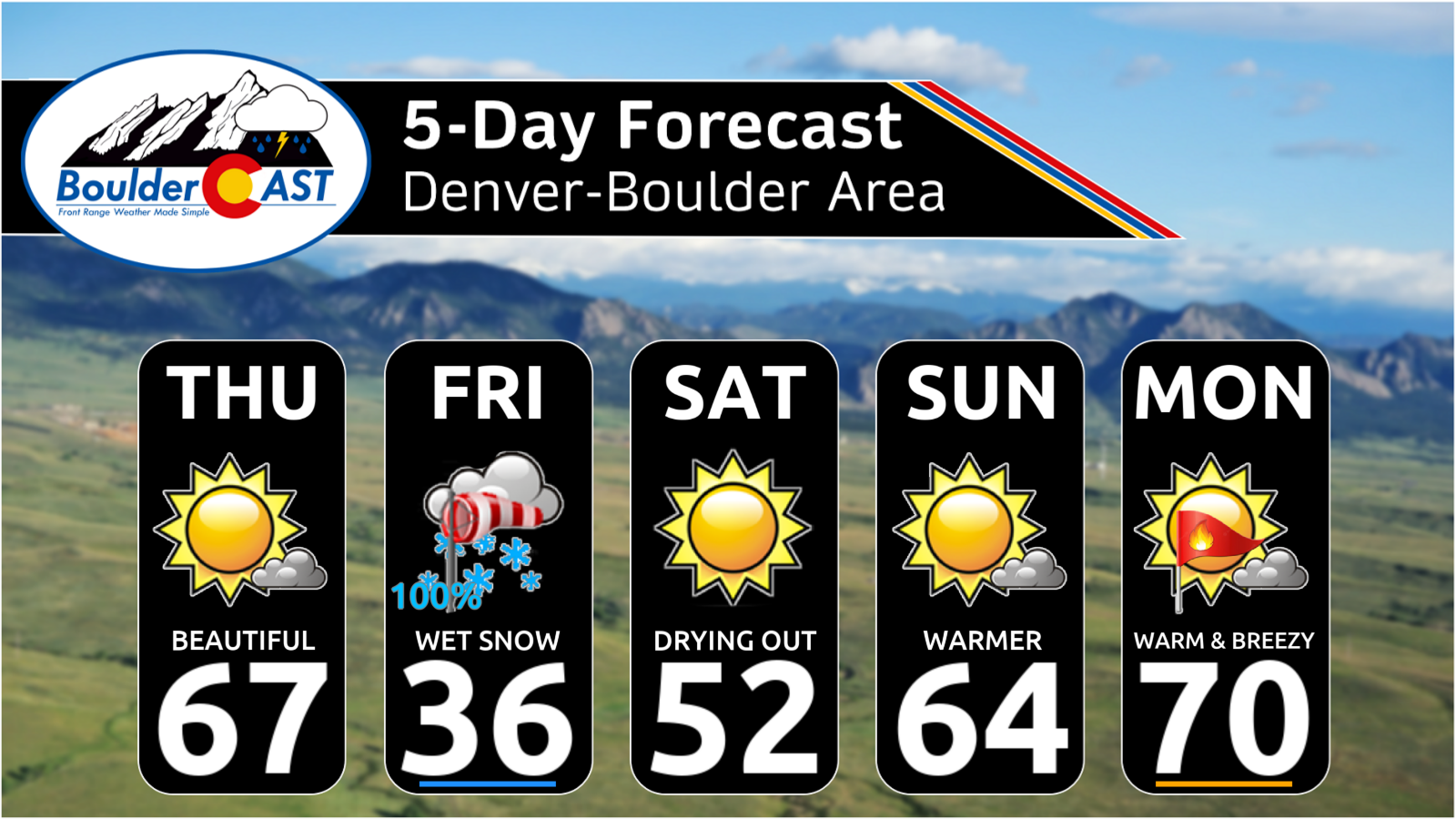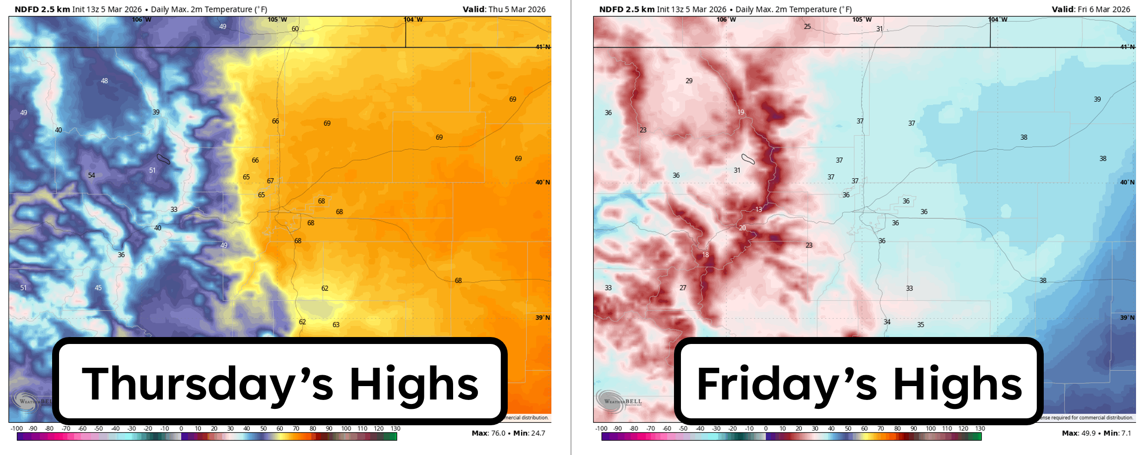 Speaking of temperatures, they’ve been have been up and down this week like a roller-coaster and that trend will continue. Thursday will feature very warm readings once again as southwest flow increases into Colorado ahead of our approaching winter storm. Highs will land in the mid to upper 60s for Boulder and Denver—another springlike affair. Things will look much different on Friday with highs about 30 to 35 degrees colder and only in the 30s!
