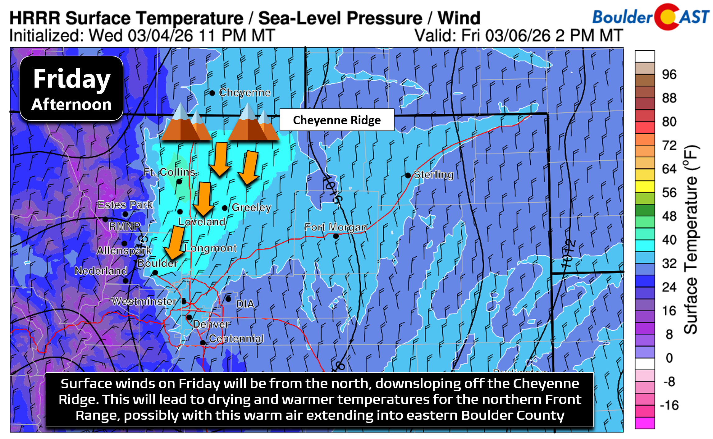 - 🏜️ Downslope north of Denver: Fort Collins–Greeley–Longmont will sit in a low-level downslope regime, keeping temps a bit warmer and limiting accumulation—this warm air may nudge into northeast Boulder too.