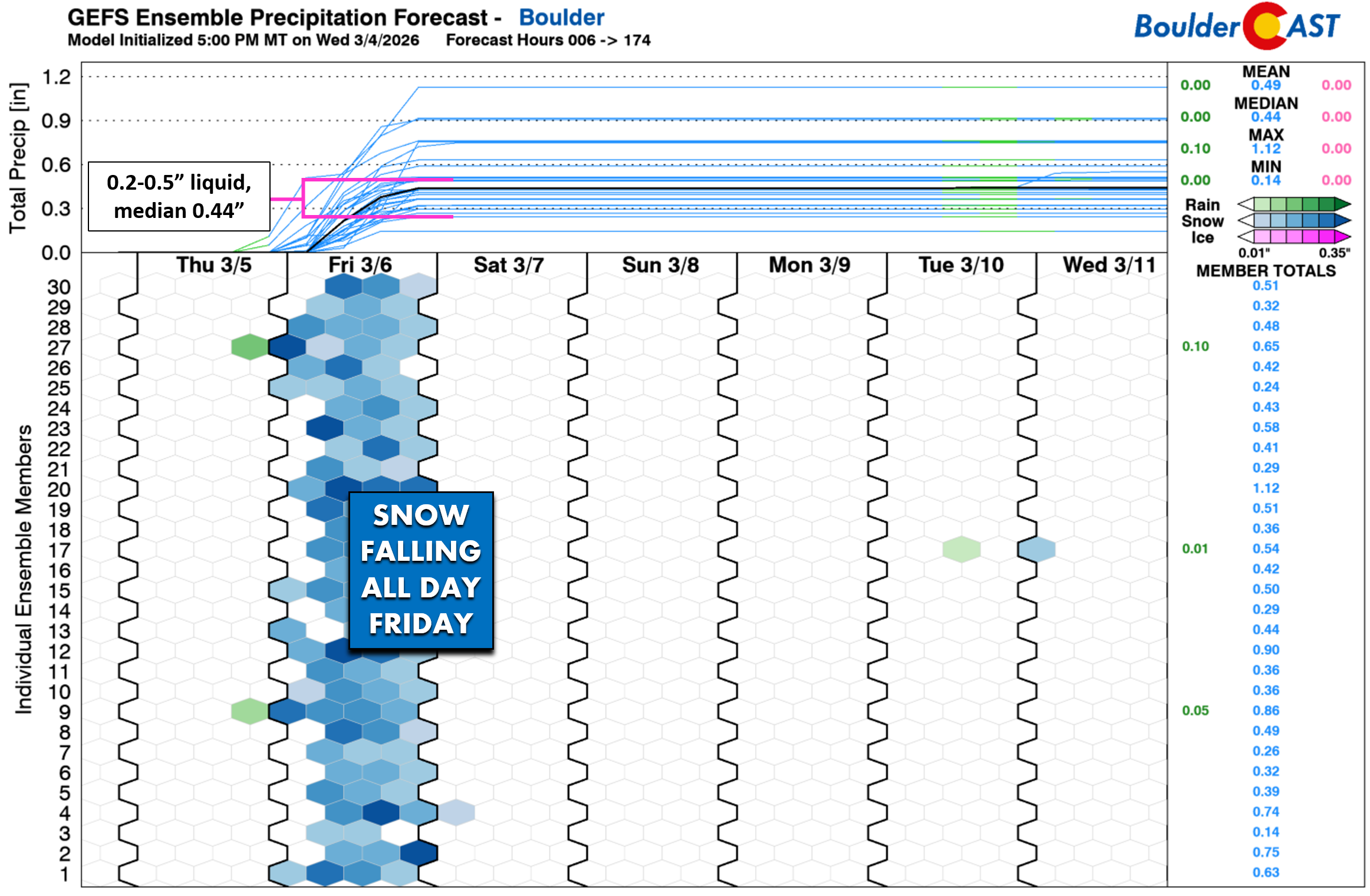 For Boulder, the GFS ensemble clusters tightly around 0.25–0.50″, with a median near 0.44″. There are really no “complete miss” solutions, but roughly a quarter of members foretell a more robust precipitation event—something to watch as the storm evolves.