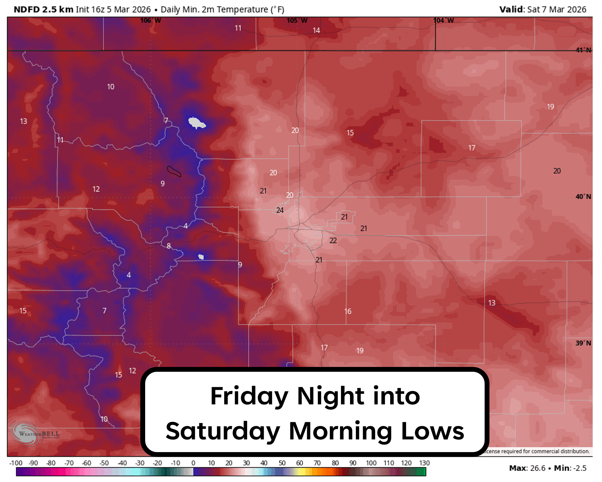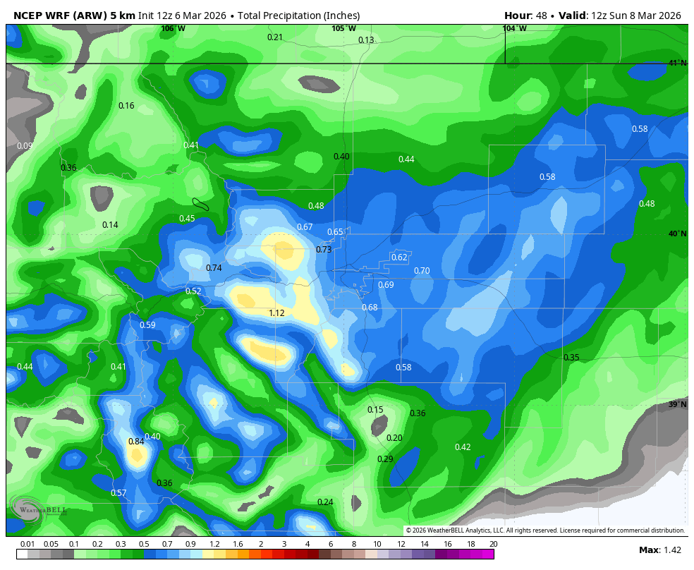 Despite the quirks of this storm—its split structure, the pesky downslope north of Denver, and the narrow temperature margins in spots—it’s poised to deliver something the Front Range has been sorely missing: meaningful moisture and a legitimate round of wintry weather. Snowfall totals will vary dramatically over short distances (especially around Boulder), and some lower‑elevation areas will struggle to accumulate snow (sorry Greeley/Longmont). More importantly though, the liquid equivalent will be solid across the board, offering a much‑needed boost to our parched soils and reservoirs, while the nearby Mountains will get a nice jolt to their struggling snowpack. By Saturday the sun will already be back, and by Sunday and Monday we’ll be rocketing into the 60s and 70s. After a dismal winter defined by near‑misses and rain, this one at least reminds us what the winter season should feel like in Colorado, even if only for a day…