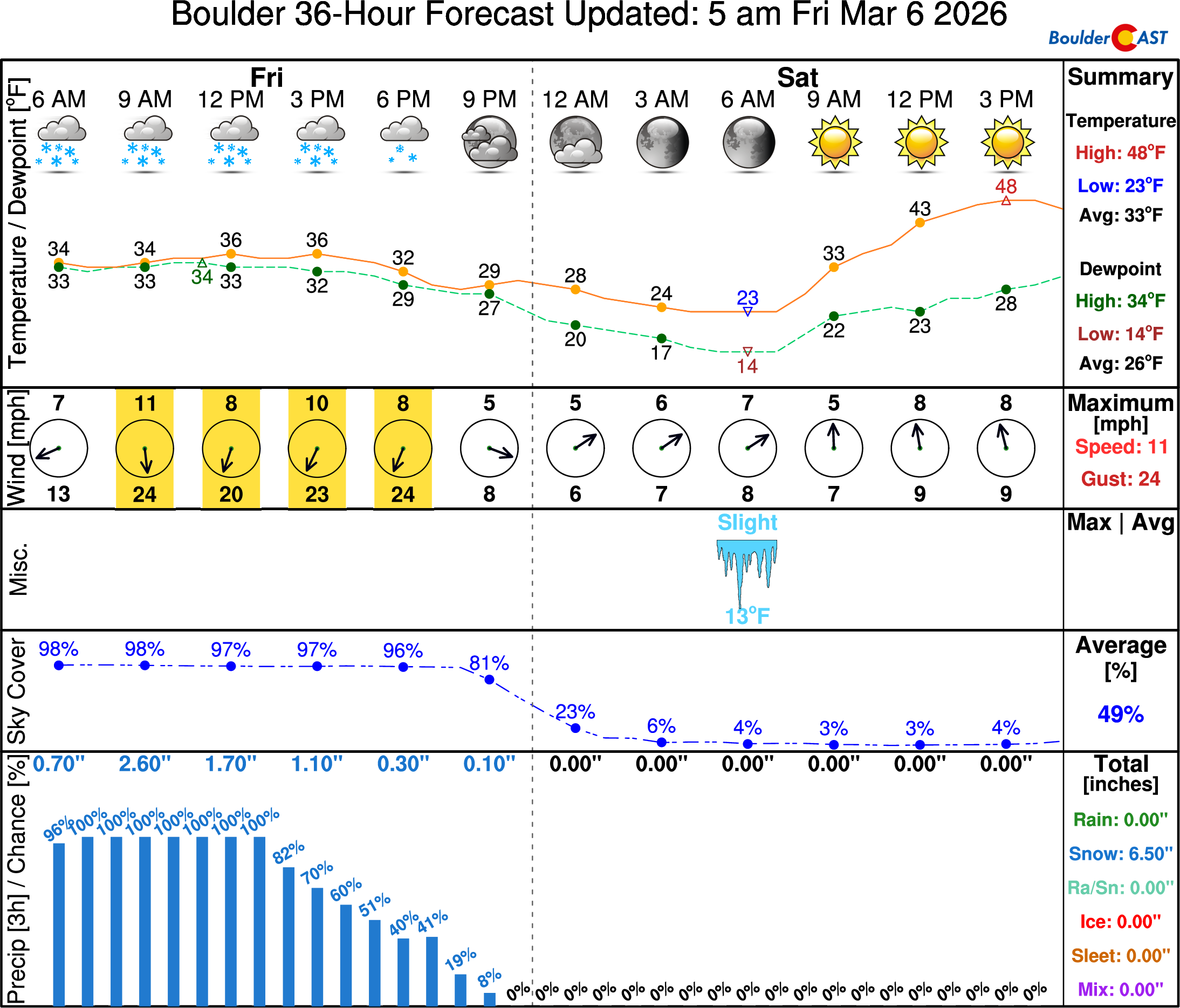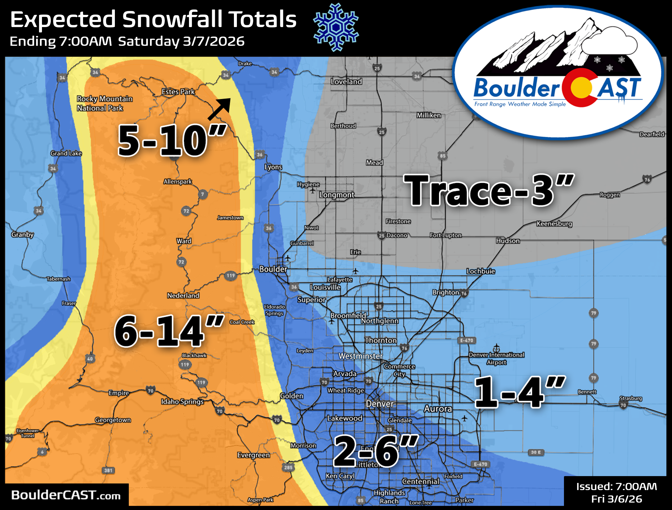 For snow amounts, that is a bit trickier. Temperatures will be near of above freezing during the day Friday so despite all the falling snow, there will be lots of melting, aided in part by the increasingly strong early March sun angle. Snow accumulation will favor the grassy and elevated surfaces for this event. In general, we’re forecasting anywhere from a trace to 6 inches of snow for the lower elevations, with 6 to 14 inches in the Foothills and Mountains (highest south). Our latest snowfall forecast map is shown below. The gradient in snow will be particularly tight in the Boulder area, where low-level warm air may invade from the northeast during the day into Gunbarrel, while the slightly higher elevation southwest part of Boulder stays colder and receives good upsloping. The heart of Denver should be safe from the warmer air, especially the further south and west you go.