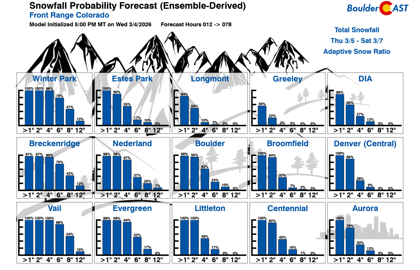 UPDATE (Friday 3/6/26 8:00AM): The majority of models have slowed our storm down allowing for a longer period of ideal snow ingredients to linger over the Front Range on Friday when moderate snow bands will impact the area. Snow amounts have been increased a tad regionwide, with slushy roads now favored for the lower elevations, and difficult travel in the Mountains/Foothills. Snow will continue all day Friday before tapering off Friday evening. Temperatures near and slightly above freezing will allow for a lot of melting. We discuss the changes to the forecast and the latest developments in Friday’s Premium Storm Update HERE.