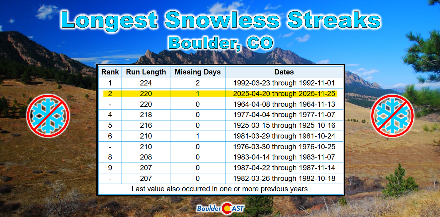 This would also bring an end to our snow drought which will land as one of Boulder’s all-time longest at 223 or more days (currently at 220 as or writing):