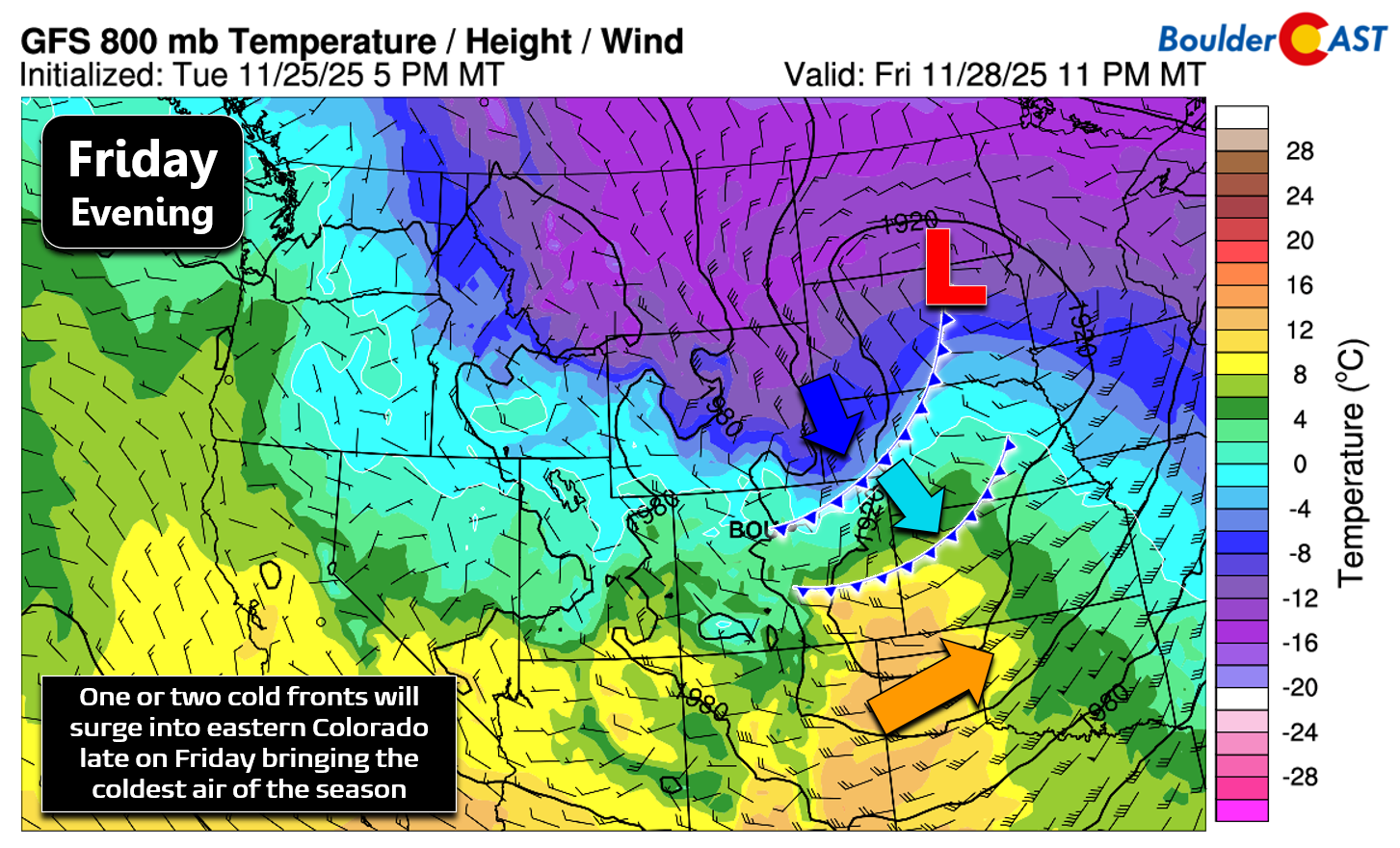 Friday’s warmth will be the last of it, though. A strong cold front barrels down the Front Range Friday evening, shutting the door on our extended fall and ushering in the season’s first true blast of winter. The front should arrive near sunset, possibly in two waves several hours apart. The air mass behind it originates in northern Canada — the coldest of the season so far.
