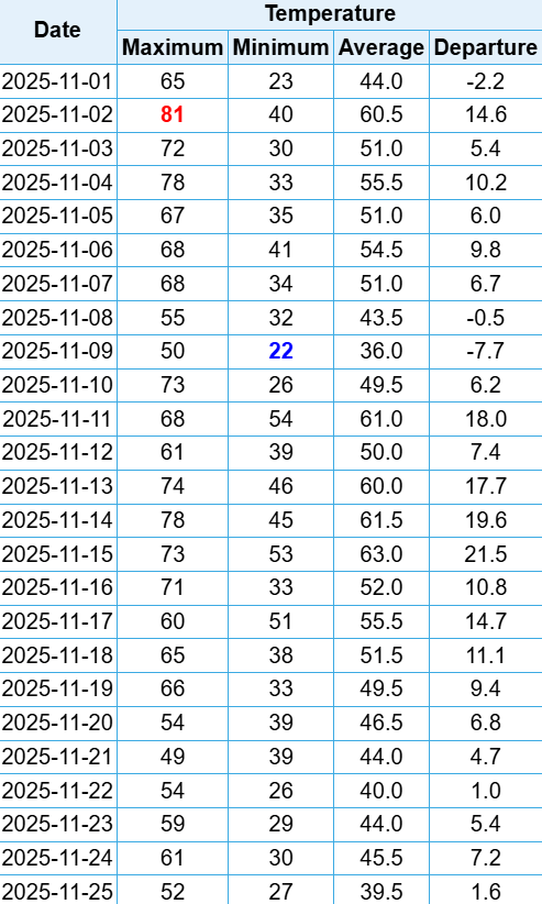- Thanksgiving Day: Mostly sunny and calm. Highs in the low to middle 50s.