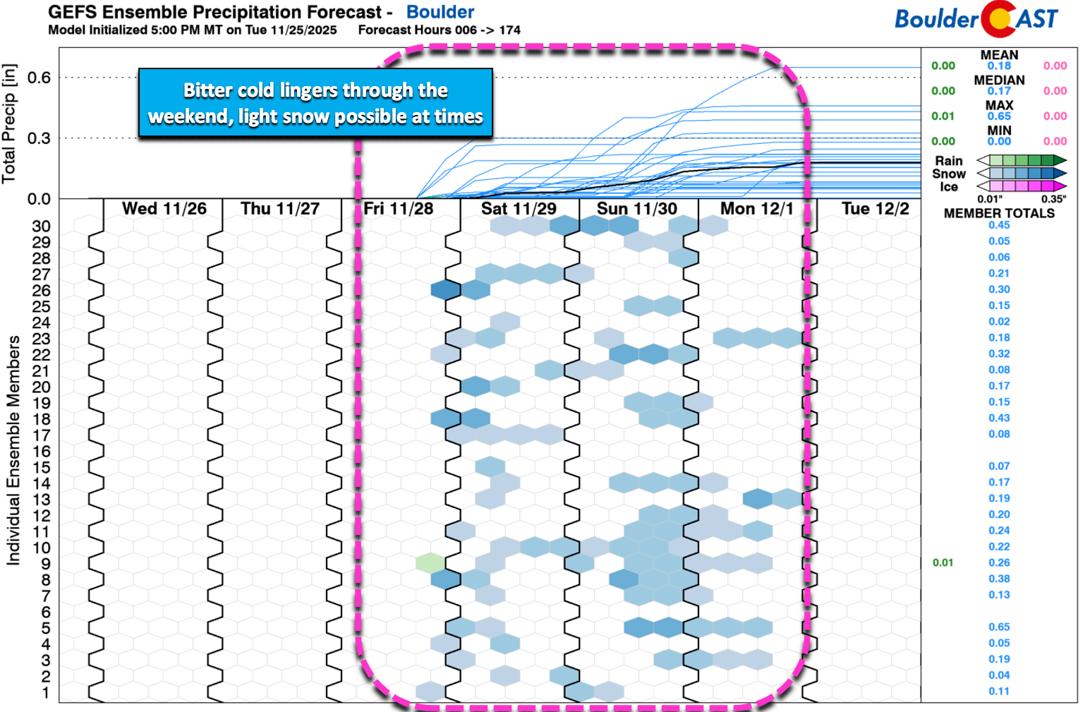 This persistent cold through the weekend is the most certain aspect of the extended forecast. The one you’re probably more interested in, the potential for snowflakes, is not as clear. The problem is, this pattern isn’t a great one for us, with most intense cold air remaining off to our east and only shallow (largely southeasterly) upslope flow for Metro area. The Mountains will probably do okay this weekend with several waves of moist northwest flow slamming into the Continental Divide. East of the Mountains, we’ll have just a brief period of lift from the passing storm system Friday night into early Saturday which may overlap with a few hours of C-tier upslope. We’re actually tracking two disturbances this weekend which should offer up the potential for light snow in our area, but you’d be hard pressed to tell that from the ensemble precipitation forecast graphic below. Models are so unsure when and where the snow will hit this weekend that it all just smears out into a sporadic peppering of light snow from Friday night through Monday morning.