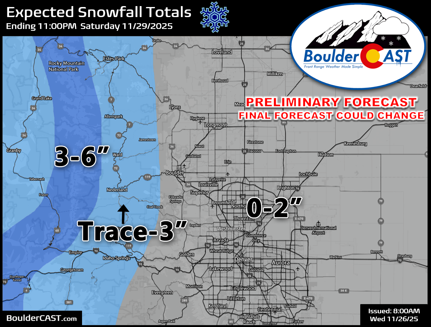 After weeks of unseasonable warmth, the Front Range is staring down its first taste of winter. Mild weather will continue for the next few days, including a beautiful Thanksgiving holiday, but by Friday night a powerful cold front will surge into Colorado, ending this historic snow drought with our first flakes of the season likely to fall. Read on for a full breakdown of what to expect and when, including our preliminary snowfall forecast map for Friday night.