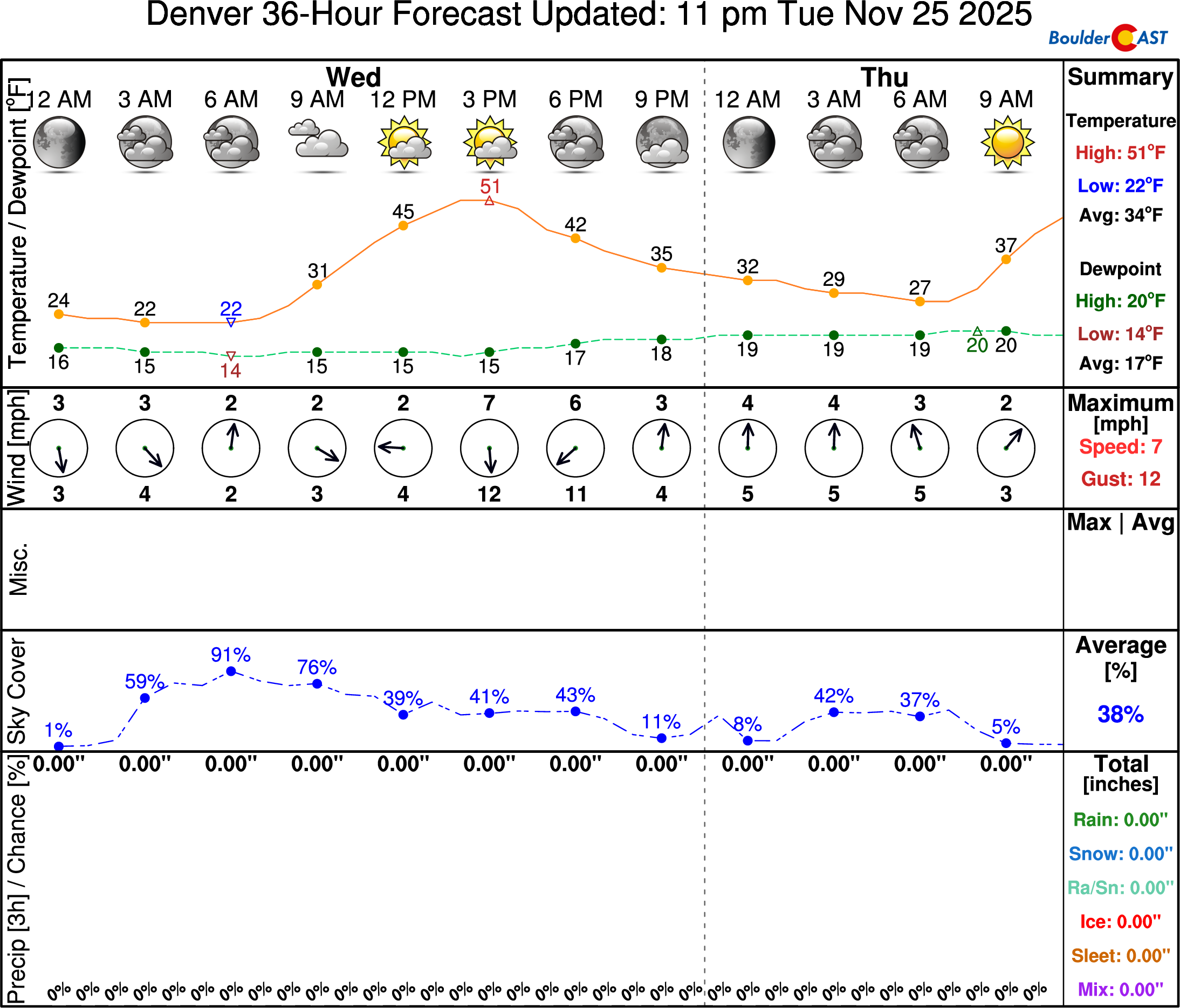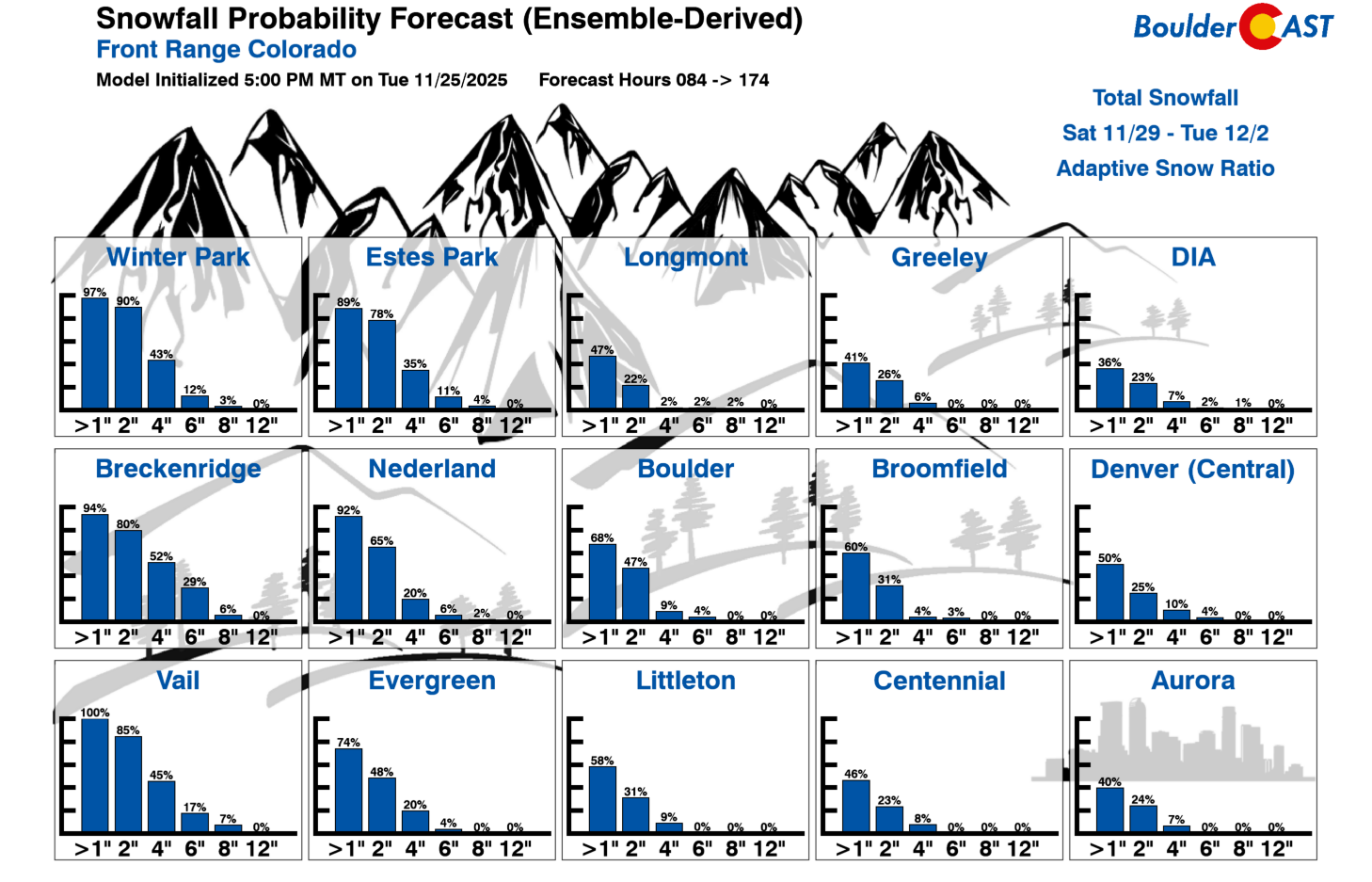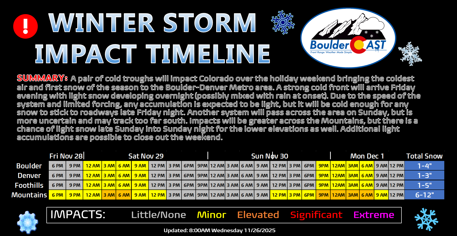 - Snow Chances: Two weak storm systems (Fri night–Sat and Sun) likely will deliver Boulder’s first measurable snow in 223+ days; light accumulations for the Metro (1-4″), but 6-12″ in the Mountains with slick travel on passes.