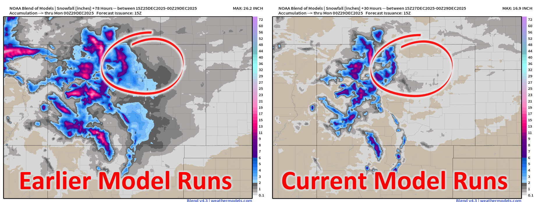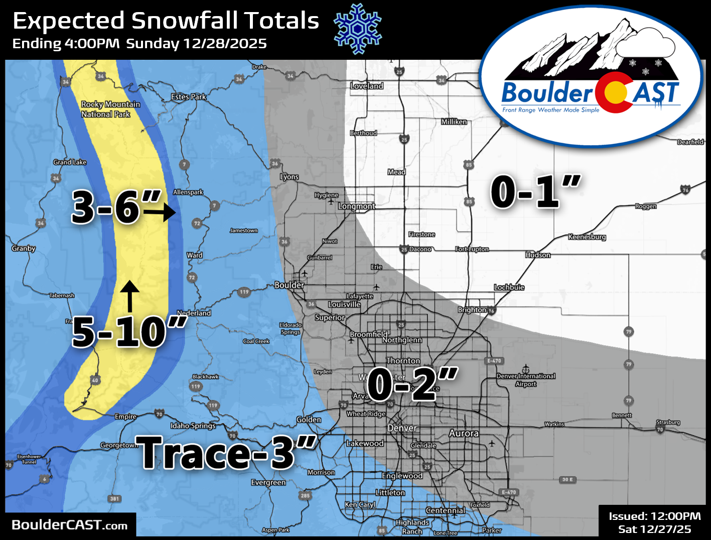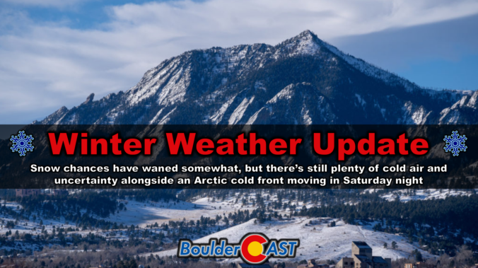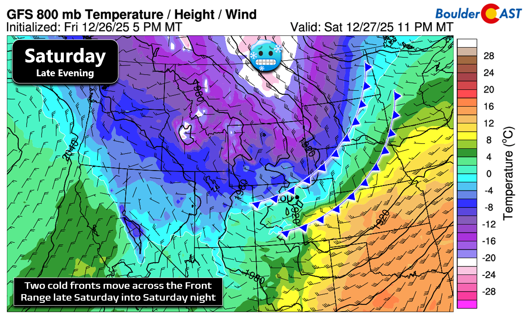 After a stretch of December warmth so extreme it rewrote some record books across the Front Range, we’re finally staring down a pattern shift—though not quite the snowy one we initially hoped for. A pair of cold fronts will bring a sharp temperature drop, a few chances for rain and snow, and at least the feeling of winter back to Boulder and Denver. The details have changed quite a bit in the last 24 to 48 hours, but we’ll walk you through what’s still on the table, what’s no longer likely, and where a few surprises could still sneak in Saturday night.