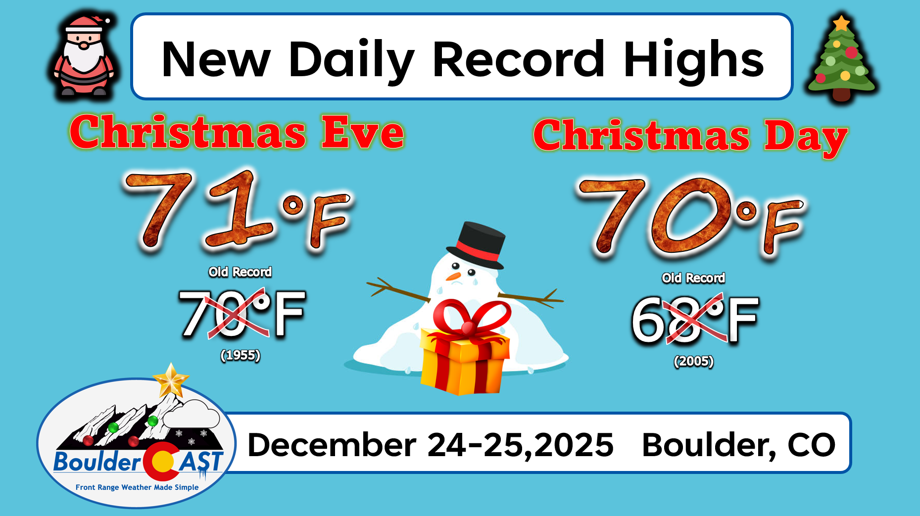 December’s warmth along the Front Range has been nothing short of remarkable—borderline historic in a few ways. We’ve smashed records multiple times over the past week, culminating in what became the warmest Christmas Eve and Christmas Day ever recorded for many Front Range cities. Boulder and Denver both soared into the low and mid‑70s and broke records on back‑to‑back days.