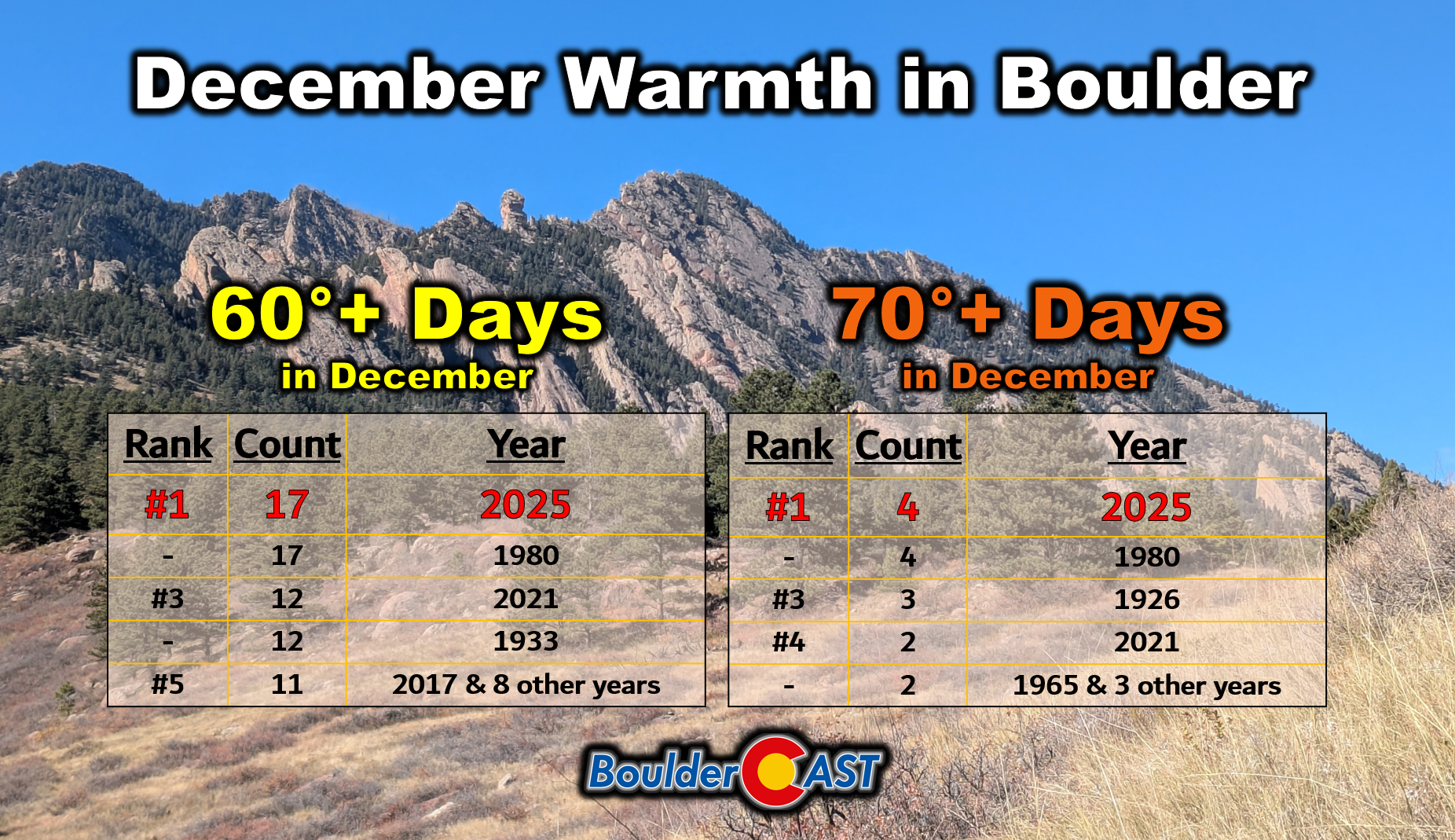 • 🌡️ Record warmth continues — Boulder had tied its all‑time December record for the number of 60°+ and 70°+ days, and also soared to its warmest temperatures ever on both Christmas Eve and Christmas Day.