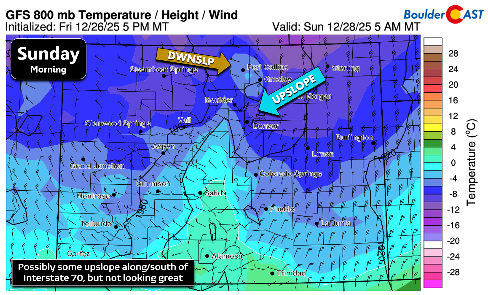 Behind the Arctic front, wind fields no longer show meaningful upslope—just straight northerly flow, and even some downslope north of Boulder. The GFS (shown below) is one of the few models still hinting at upslope along and south of I‑70, but it’s increasingly an outlier.