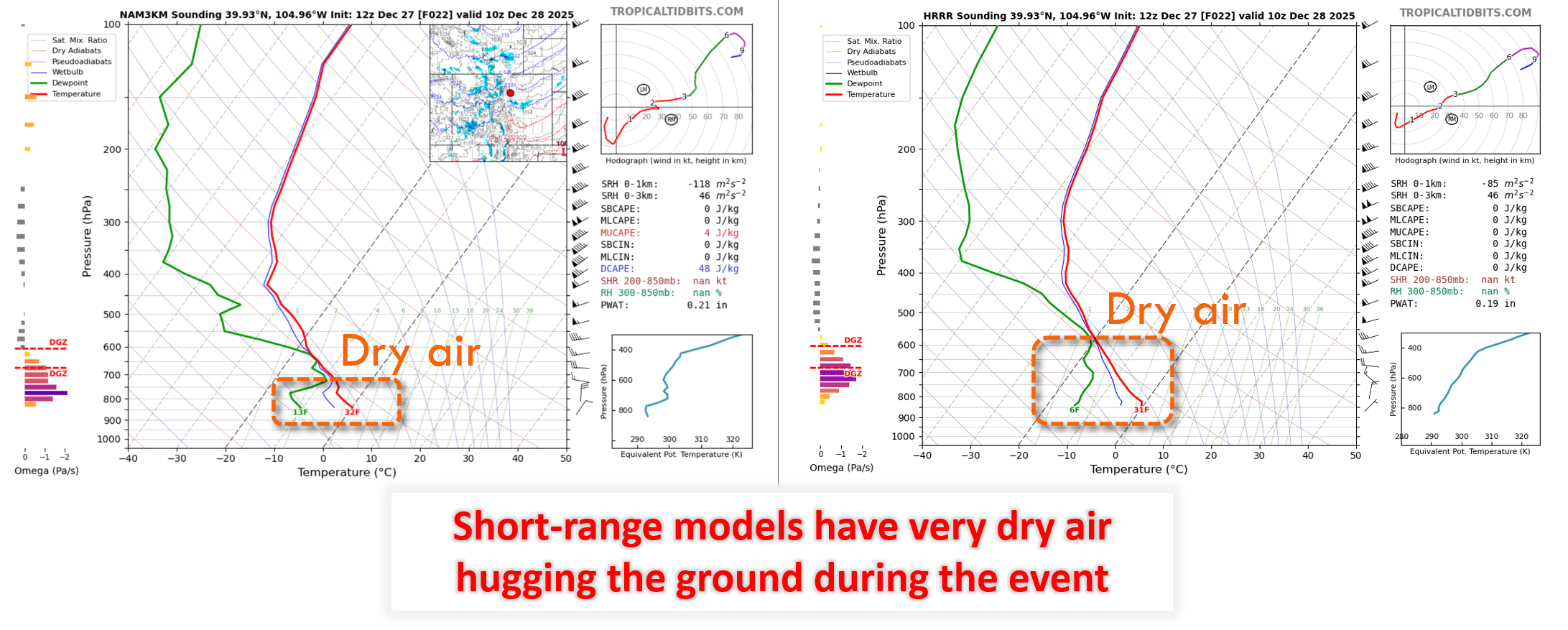 That said, if a band does manage to form, localized totals of 1–3 inches (maybe 4″) are still possible—mainly west of I‑25 and south of I‑70. But at this point, only the global models are hanging onto that idea, and it’s unclear how they plan to overcome the dry air problem.
