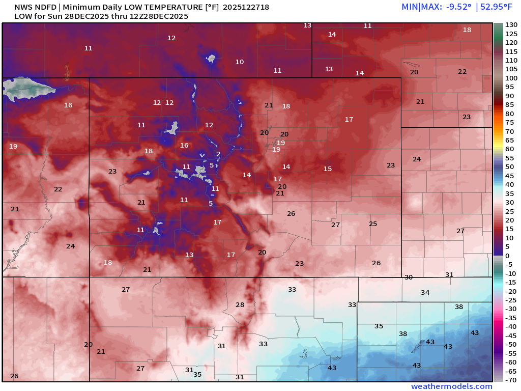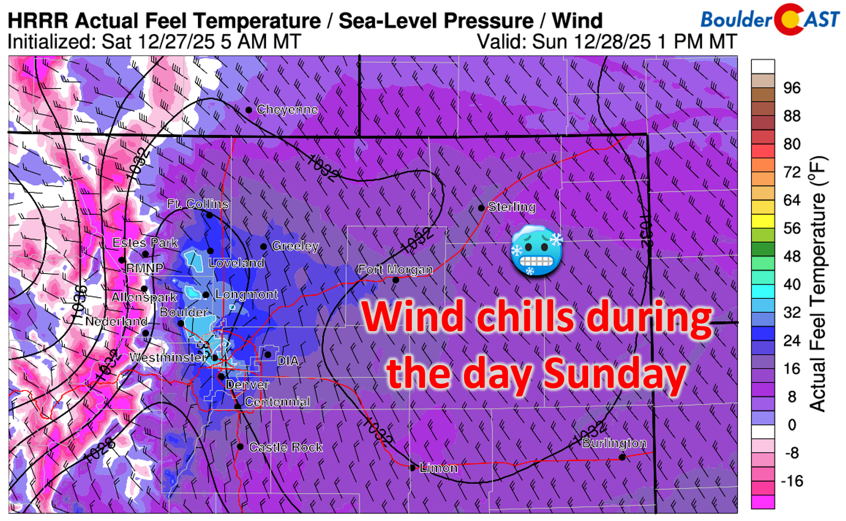 • Sunday afternoon: Highs near freezing; blustery north winds east/northeast of Denver with wind chills in the teens and single digits