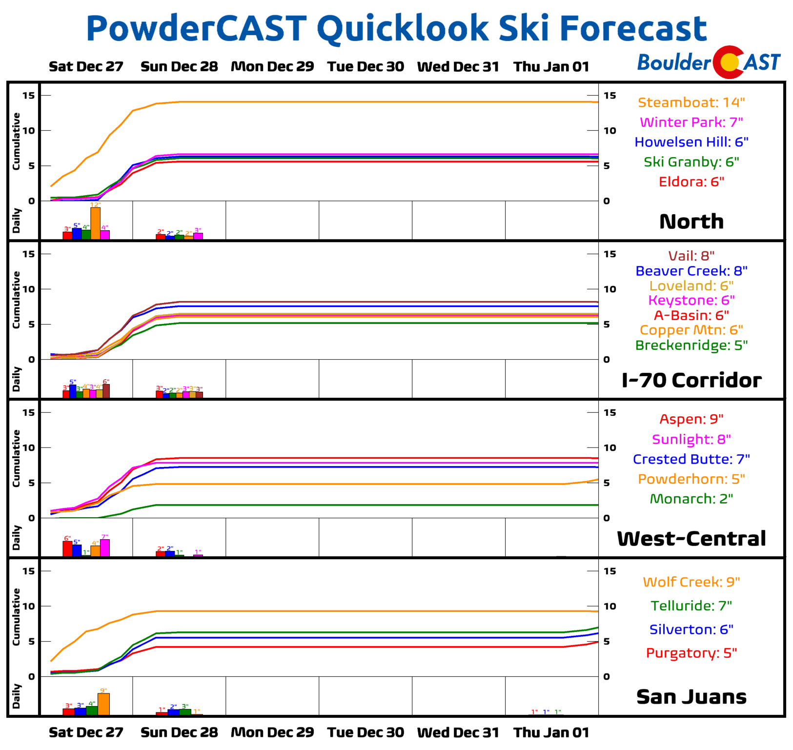 Snow will spread into the Mountains during the afternoon and especially Saturday evening, with totals of 5 to 10 inches possible in the high peaks north of Interstate 70 by midday Sunday. Skiers should plan to stay near or north of I-70 for the best skiing this weekend.