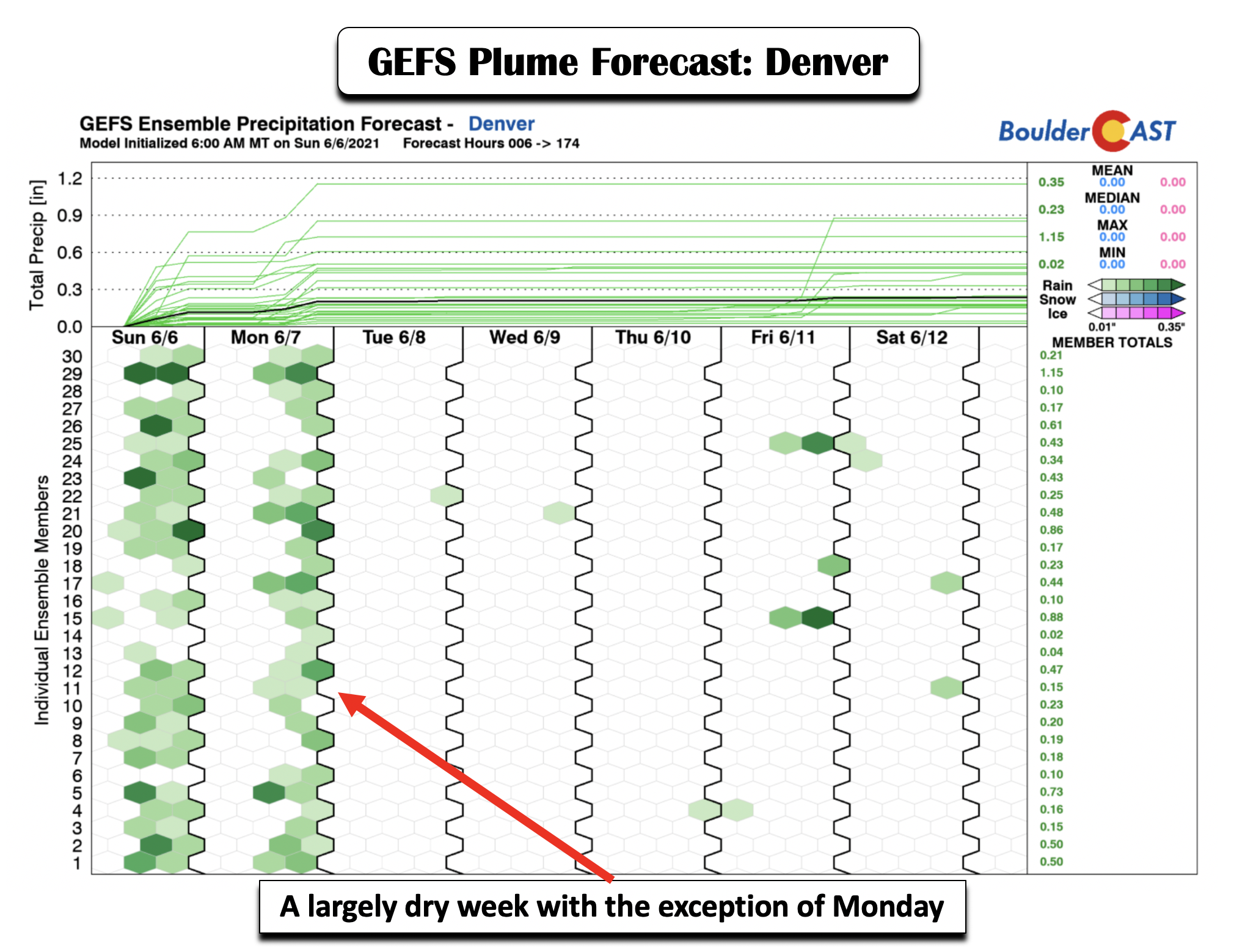 The week’s weather will trend hot and dry, with a few exceptions. Taking a look at the GEFS ensemble plume forecast for precipitation in Denver this week (below), you’ll notice that Monday has the highest probability of seeing isolated to scattered storms. The rest of the week is largely void of any rain, with the exception of a few very meager chances Tuesday through Saturday.