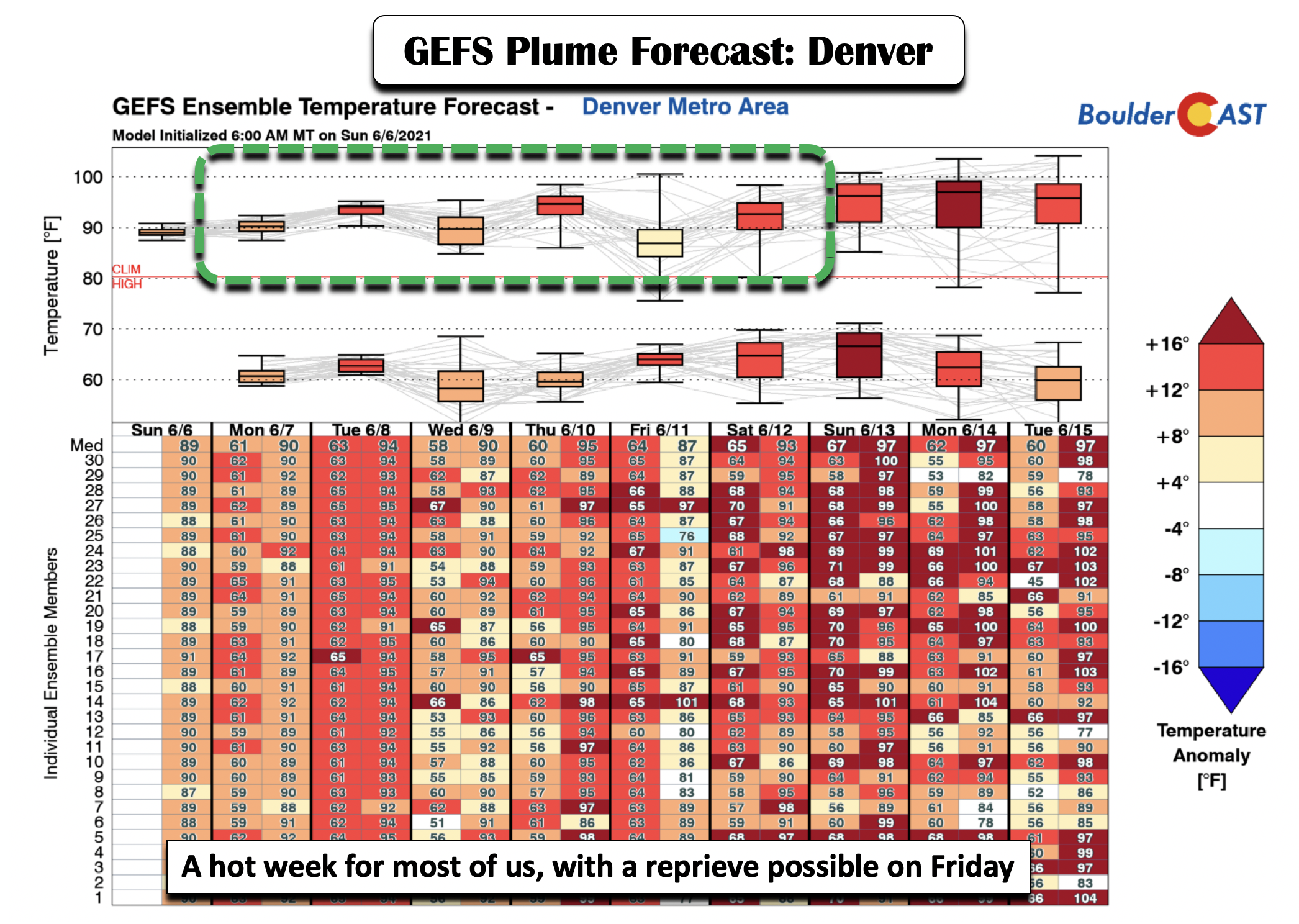 Shown below is the GFS ensemble plume for Denver but this time for temperature. There is a close correlation here between the warm temperatures (well into the 90’s) and the lack of rainfall this week. We’ll discuss this in more detail as we go through our discussion. But suffice to say, it will largely be hot and dry this week. There are some hints, though, that we could end the week cooler on Friday, which would offer a nice reprieve from the 90’s. Speaking of which, those 90’s are expected to return once again for the upcoming weekend and early next week. As you can see below, upper 90’s to low 100’s may be on the table in the extended!
