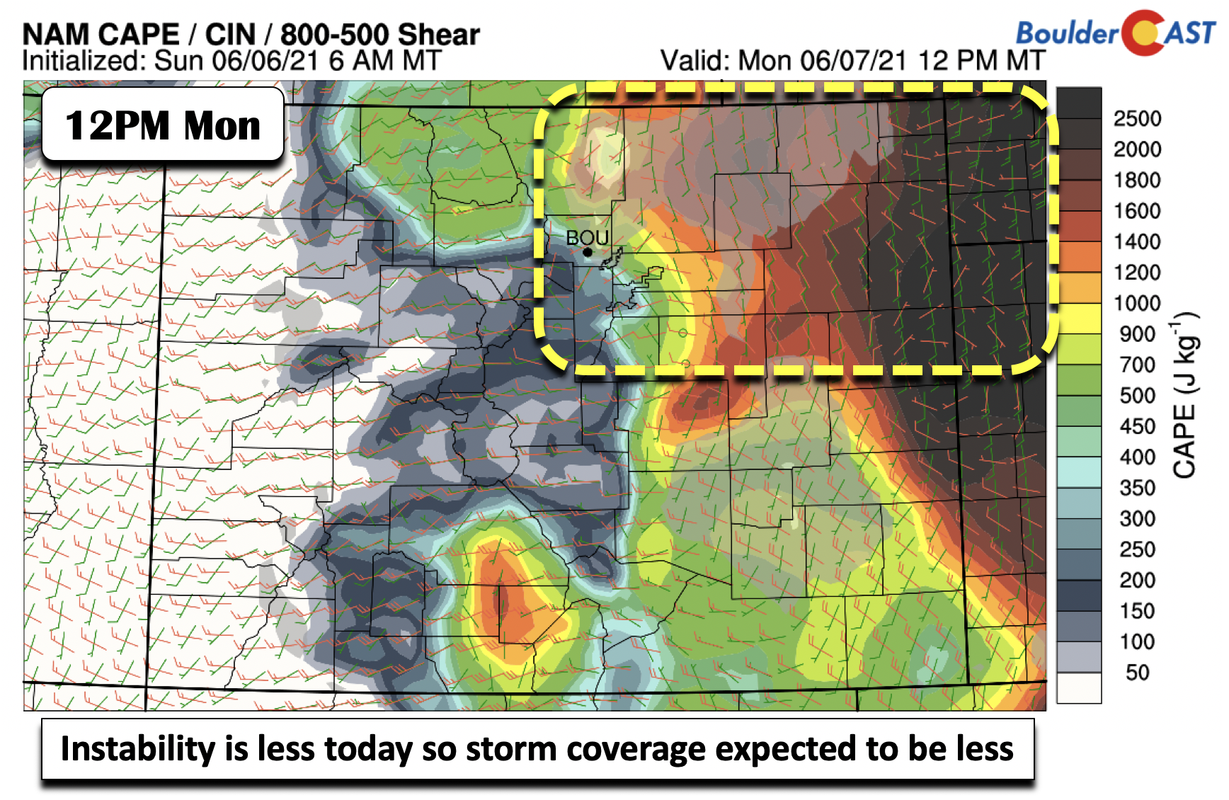 The overall pattern today is fairly similar to Sunday. The few changes include overall weaker instability and partial downslope flow. This will help focus storms and most of the rainfall east of the Denver area on Monday. Temperatures should be similar again nearing the 90-degree mark.