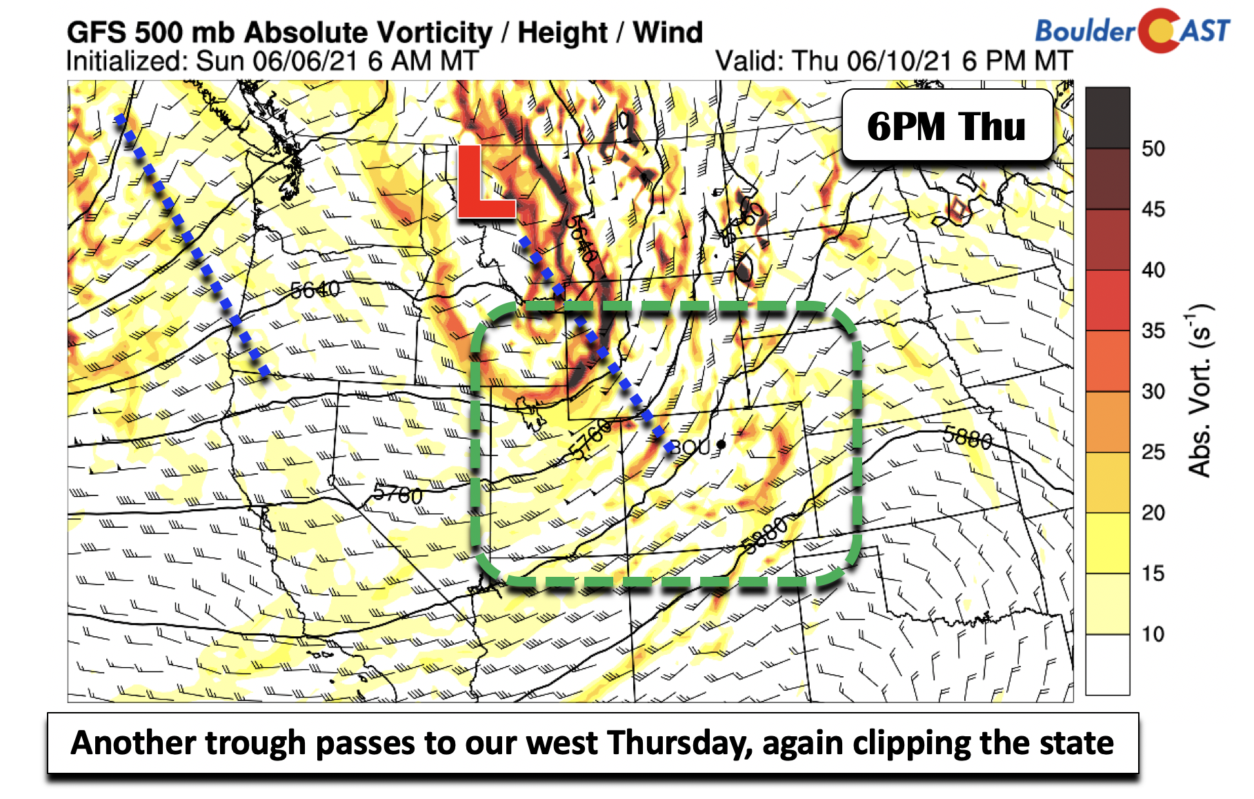 Another system passes to our west-northwest on Thursday, tracking up into Montana. While both of these systems will need to be monitored for track changes for potential increased storm chances, in general they will force drier air into the state, further inhibiting chances of rainfall. Storms, however, cannot be entirely ruled given the close proximity of the deep upper-level lift and dynamics, which for right now largely remain in Wyoming both days.