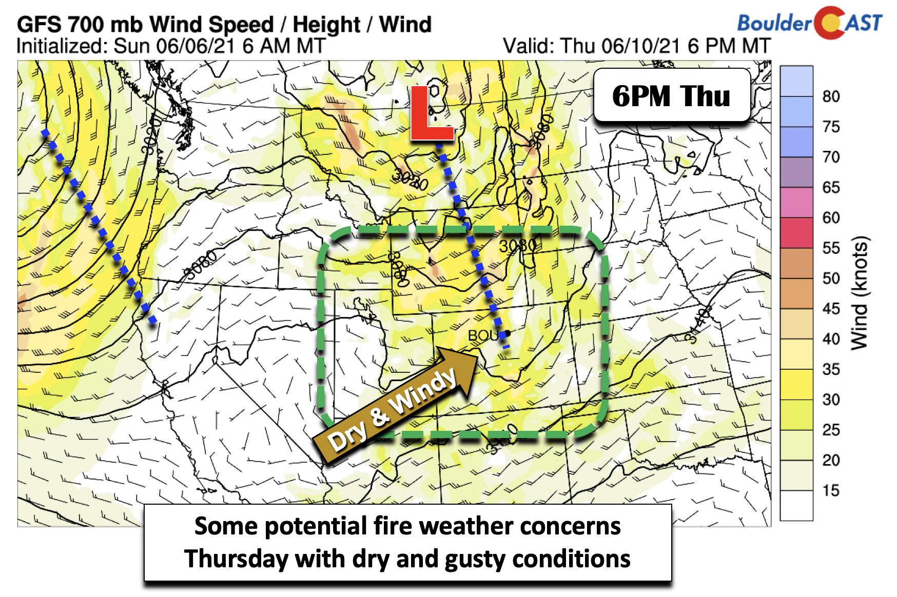 We are watching for potential fire weather conditions on Thursday. The aforementioned system will bring not only dry air, but also gusty winds in the low to mid-levels, especially across the Western Slope where extreme drought remains. It’s certainly too early to say for sure, but Red Flag conditions may exist across the Front Range and much of Colorado with breezy conditions present.