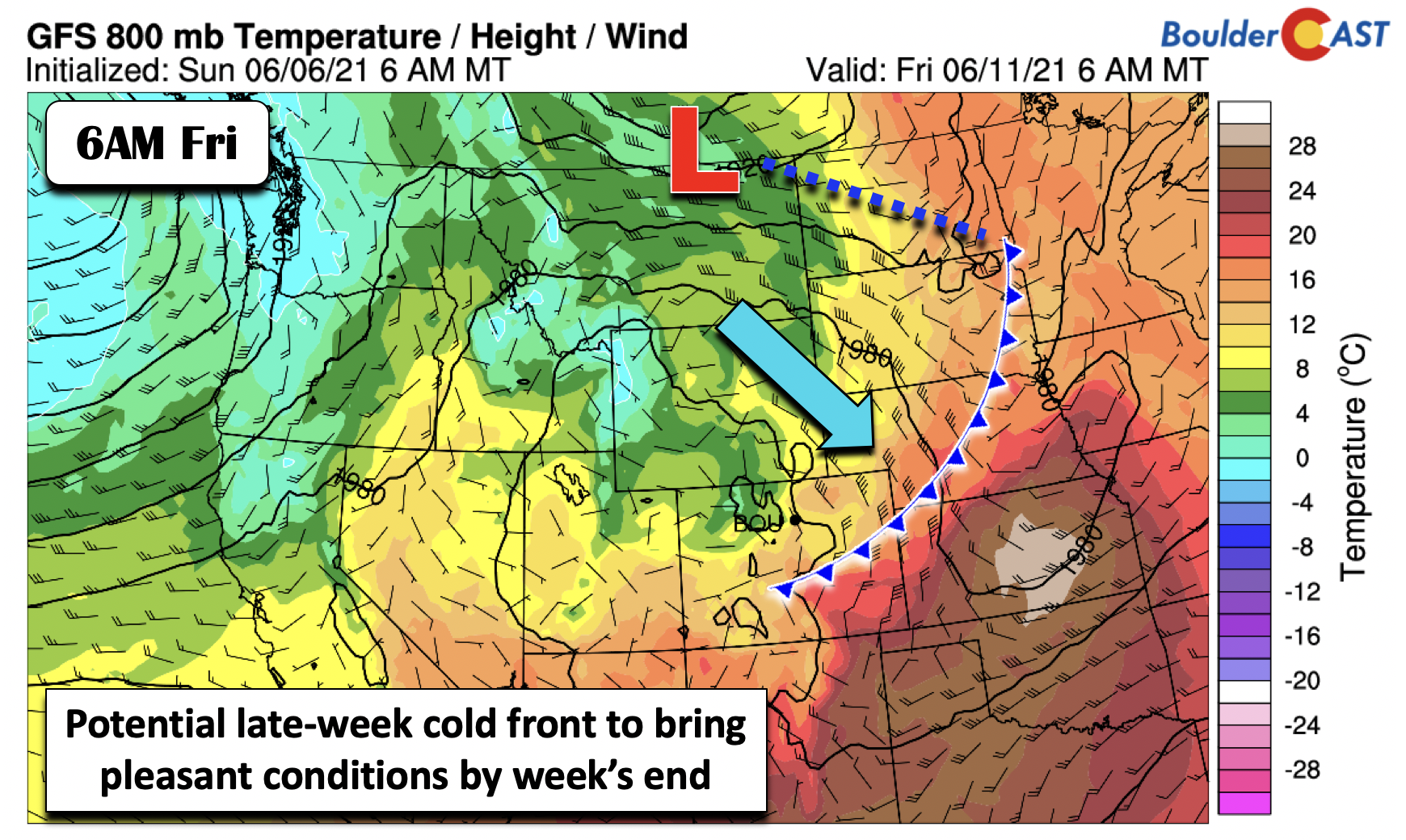 By early Friday, the second low pressure system that tracks up into Montana is forecast to bring a cold front through the Front Range. Hooray! While the exact frontal placement is uncertain at this point, it would make for a welcomed change from the low and middle 90’s prior to Friday. The nearby front could also warrants a slight chance of late-day storms, although the airmass will again be fairly dry, so our expectations are low for any rainfall. We’ll have to wait and see how this front shakes out, but do know that there is a light at the end of the hot tunnel with highs set to drop back into the 80’s to close out the week!