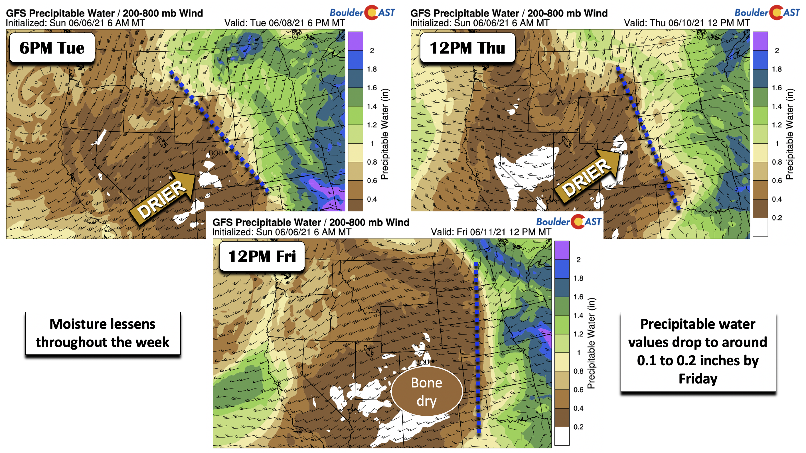 The images below show the successive drying out of the atmosphere over Colorado from Tuesday through Friday as these systems track from south to north. Notice how the brown and white shaded areas fully engulf eastern Colorado by Friday. So while we can’t fully rule out a storm chance as these systems pass through, the storm threat at this point is extremely low.