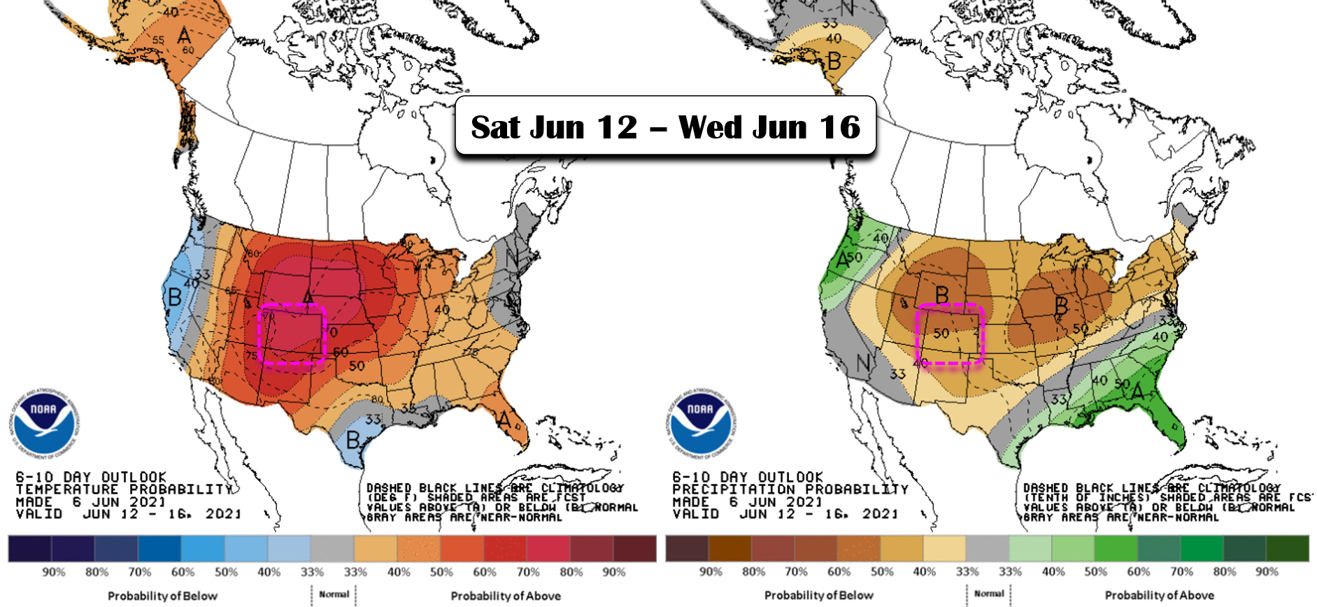 Any potential cool down will be short-lived, however, as a strong ridge of high pressure is expected to rebuild across Colorado this weekend. This ridge will keep storms chances very low to non-existent for the Front Range with highs returning to the 90’s for the weekend ahead. The latest 6 to 10 day forecast from the Climate Prediction Center (shown below) has the Front Range smack in the middle of the bullseye for hot and dry weather to continue well into next week. As mentioned earlier, there is some model consensus that the heat will ramp up further next week for us with possible triple digit temperatures across portions of northeast Colorado. We’re only two weeks from the official start of summer. Mother Nature is certainly making a strong case for that to be sooner.