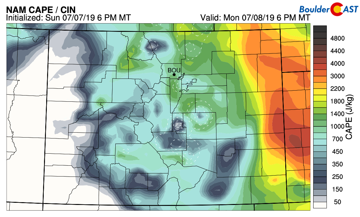 The Storm Prediction Center includes both Boulder and Denver in the “Marginal Risk” for severe thunderstorms in their outlook. As expected, further northeast across the Plains has a higher risk of large hail and even damaging winds by early evening.