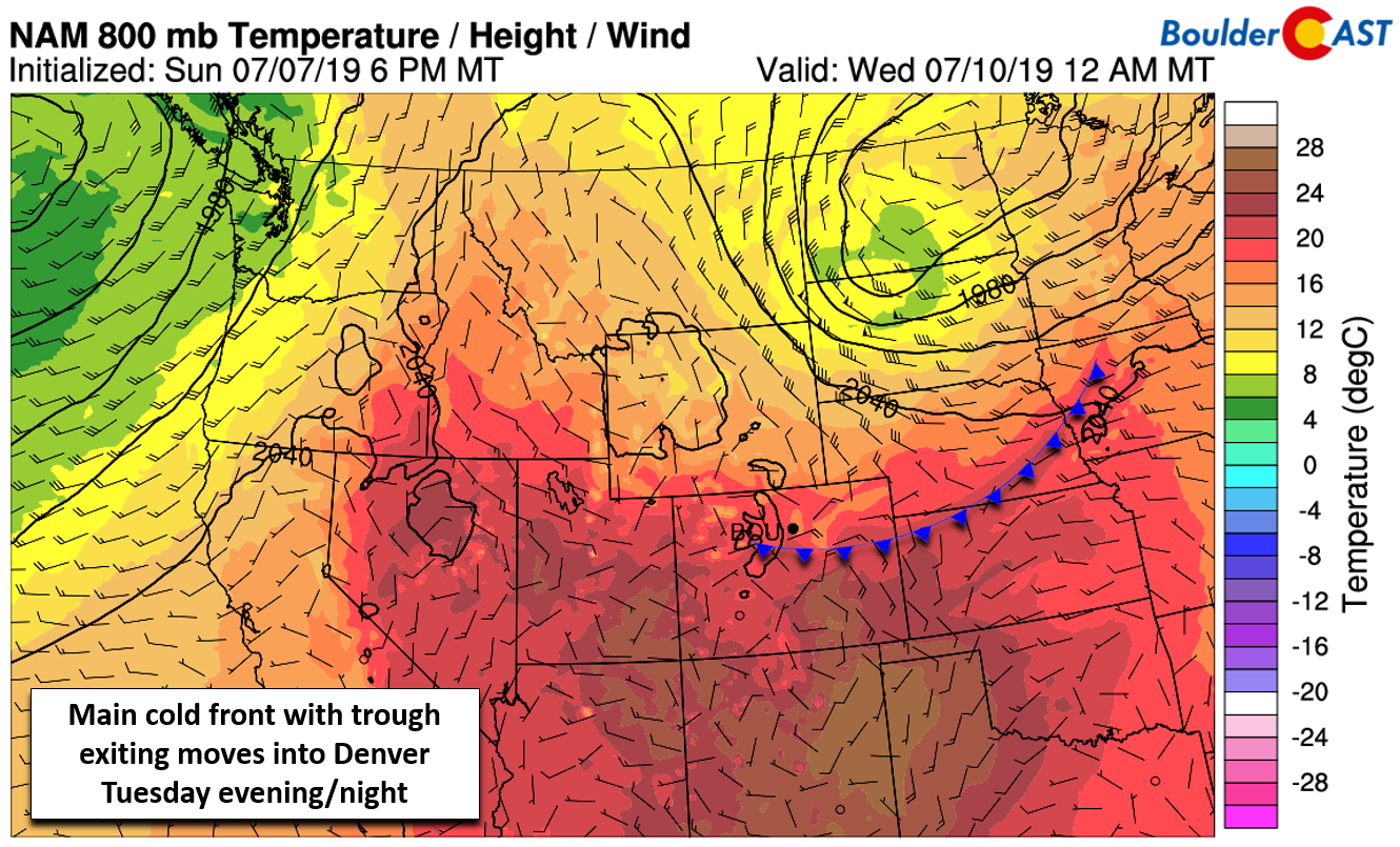 The net result of this pattern shift will be a return to typical July weather across the Front Range. Temperatures will push into the low to middle 90’s with very small chances for storms developing each afternoon and evening. This will be the case Thursday, Friday, and likely both days of the upcoming weekend…