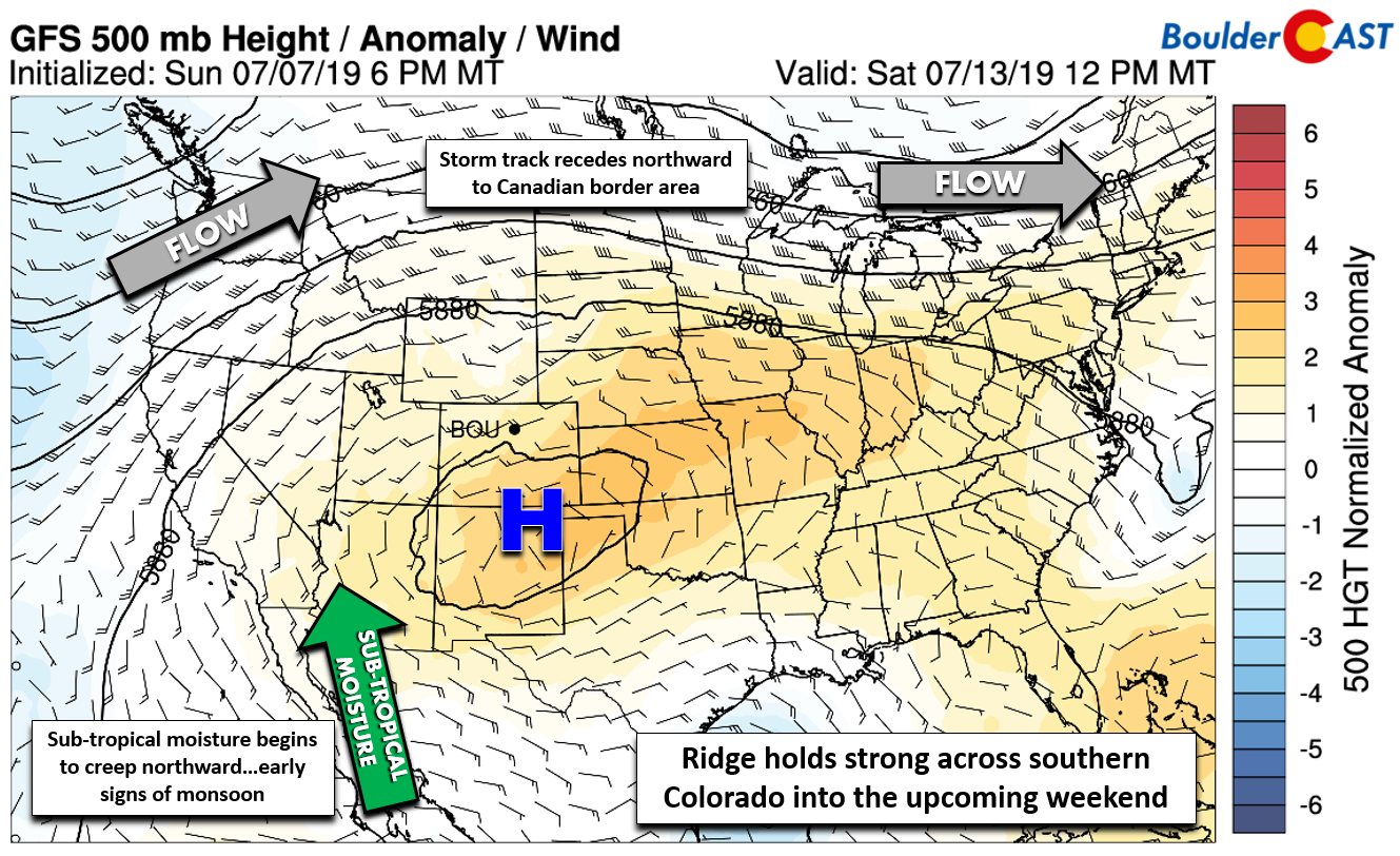 The aforementioned mid-level ridge will remain parked across southern Colorado and northern New Mexico right into the upcoming weekend. This will push the strongest mid-latitude flow and general storm track northward near the Canadian border. At the same time, persistent deep clockwise flow around the ridge will begin to advect sub-tropical moisture into Arizona and southern California.